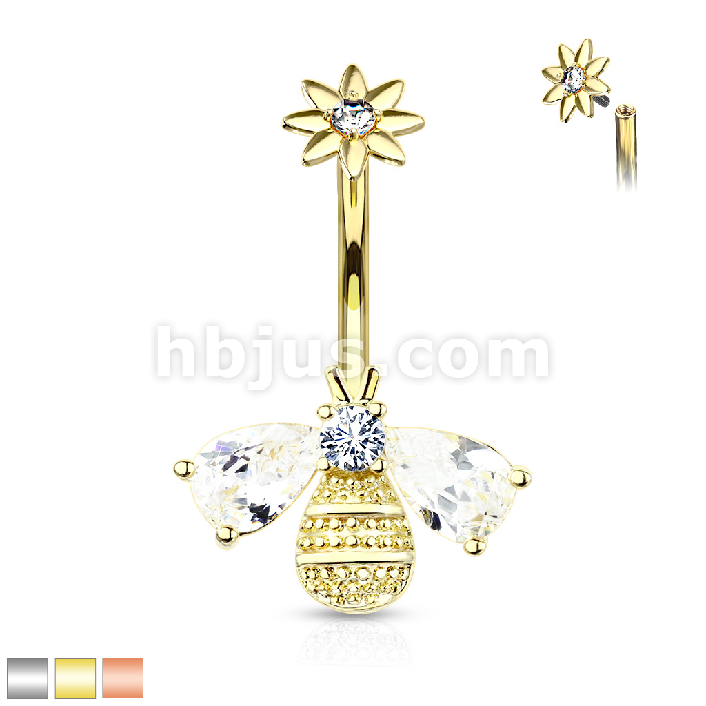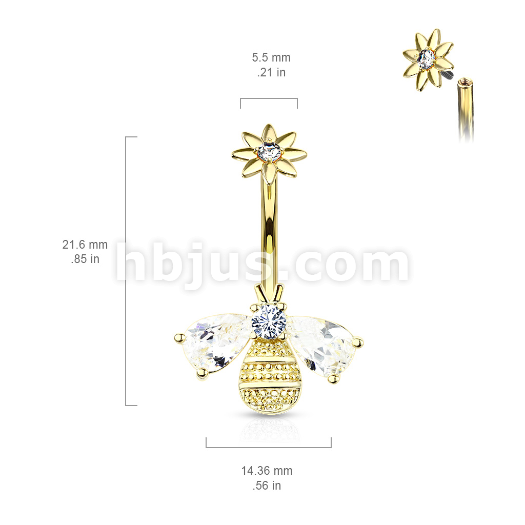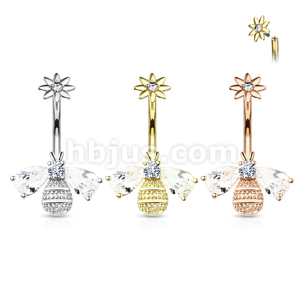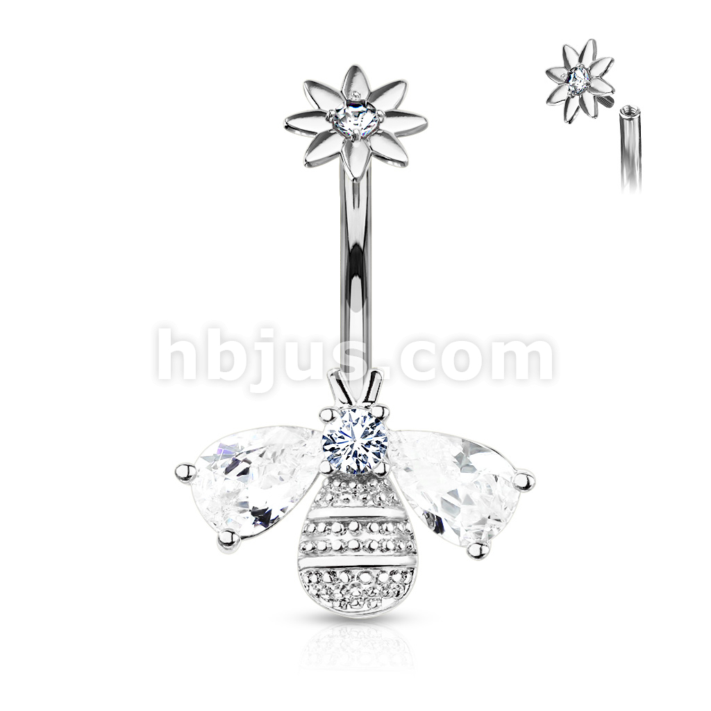 316L Surgical Steel Bee With CZ Wings and Face With Internally Threaded CZ Center Flower Top Belly Button Ring