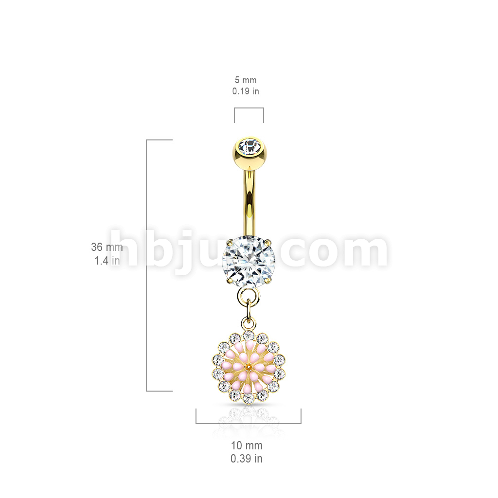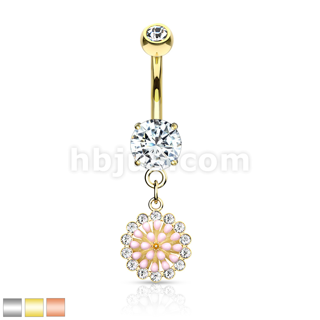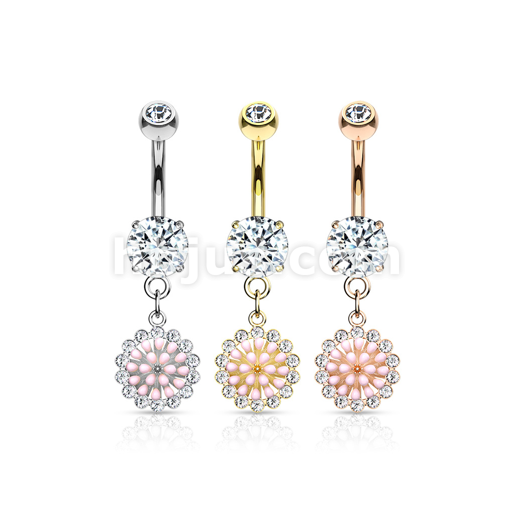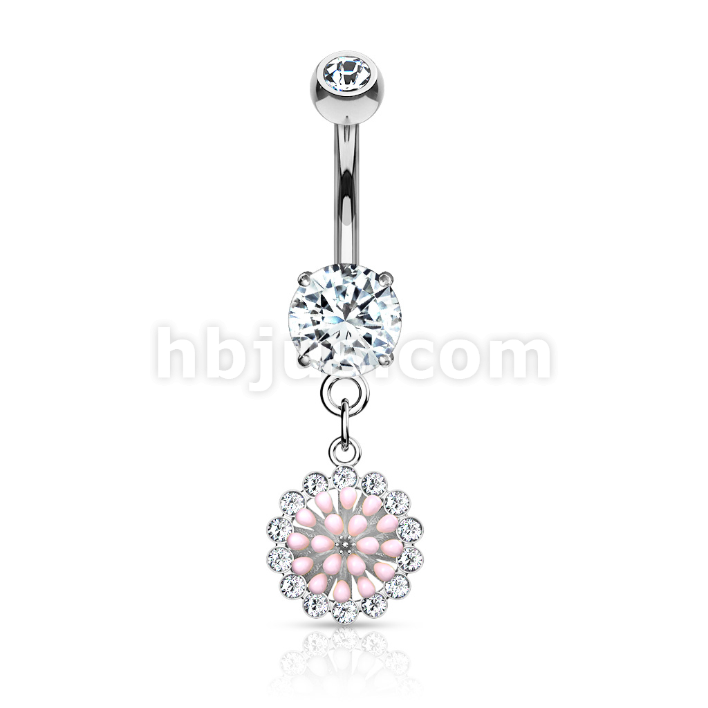 316L Surgical Steel Pink Enamel Cluster With CZ Around Dangle Round CZ Set Belly Button Ring