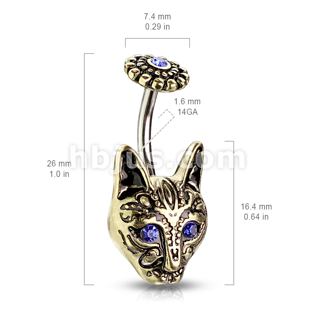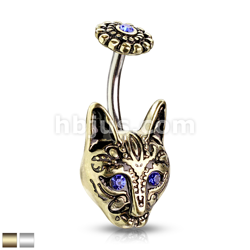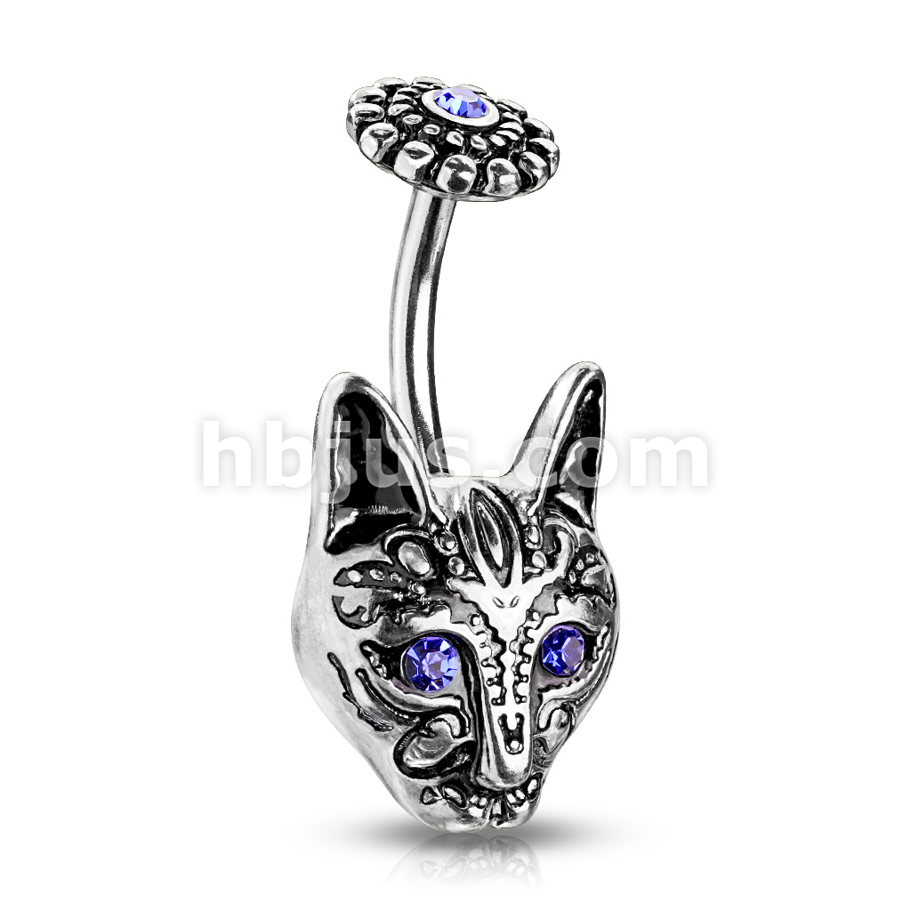 316L Surgical Steel Blue Crystal Eyes Tribal Cat With Blue Crystal Center Flower Top Belly Button Ring