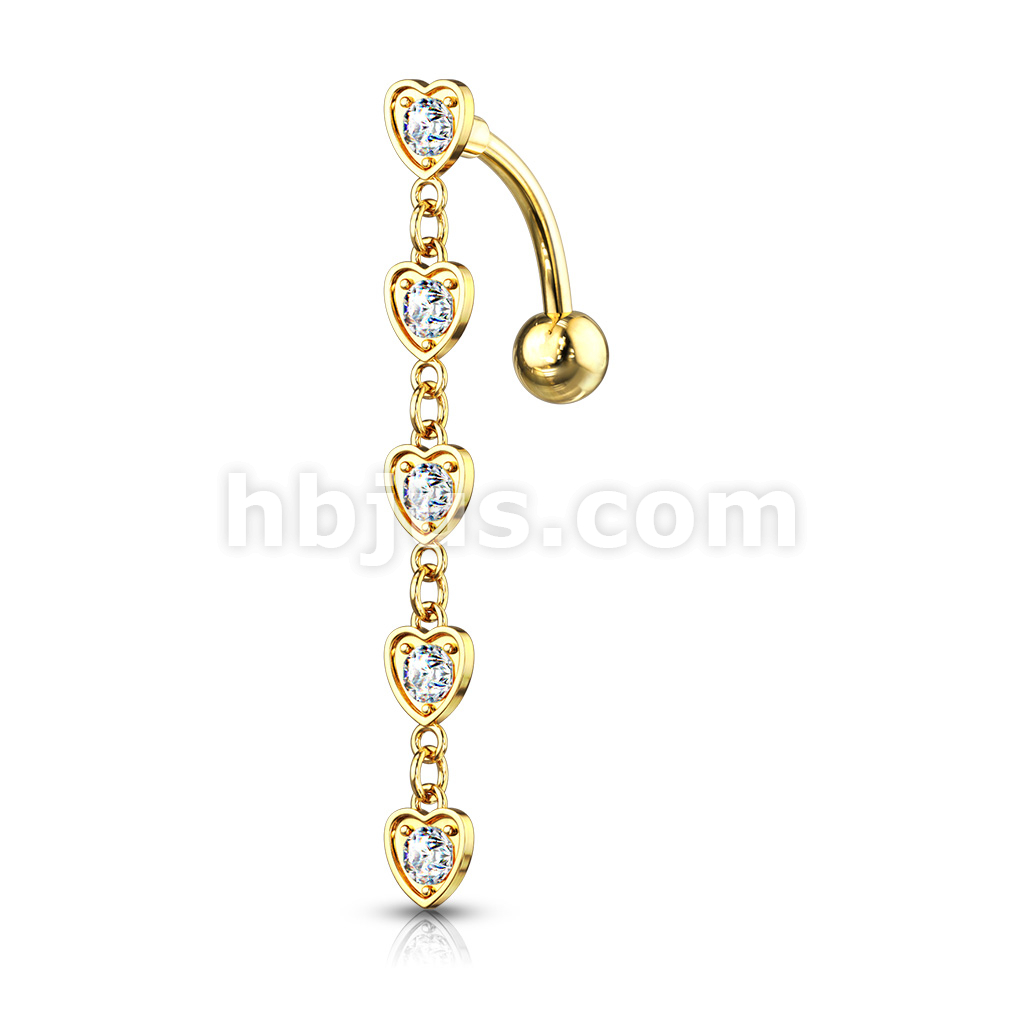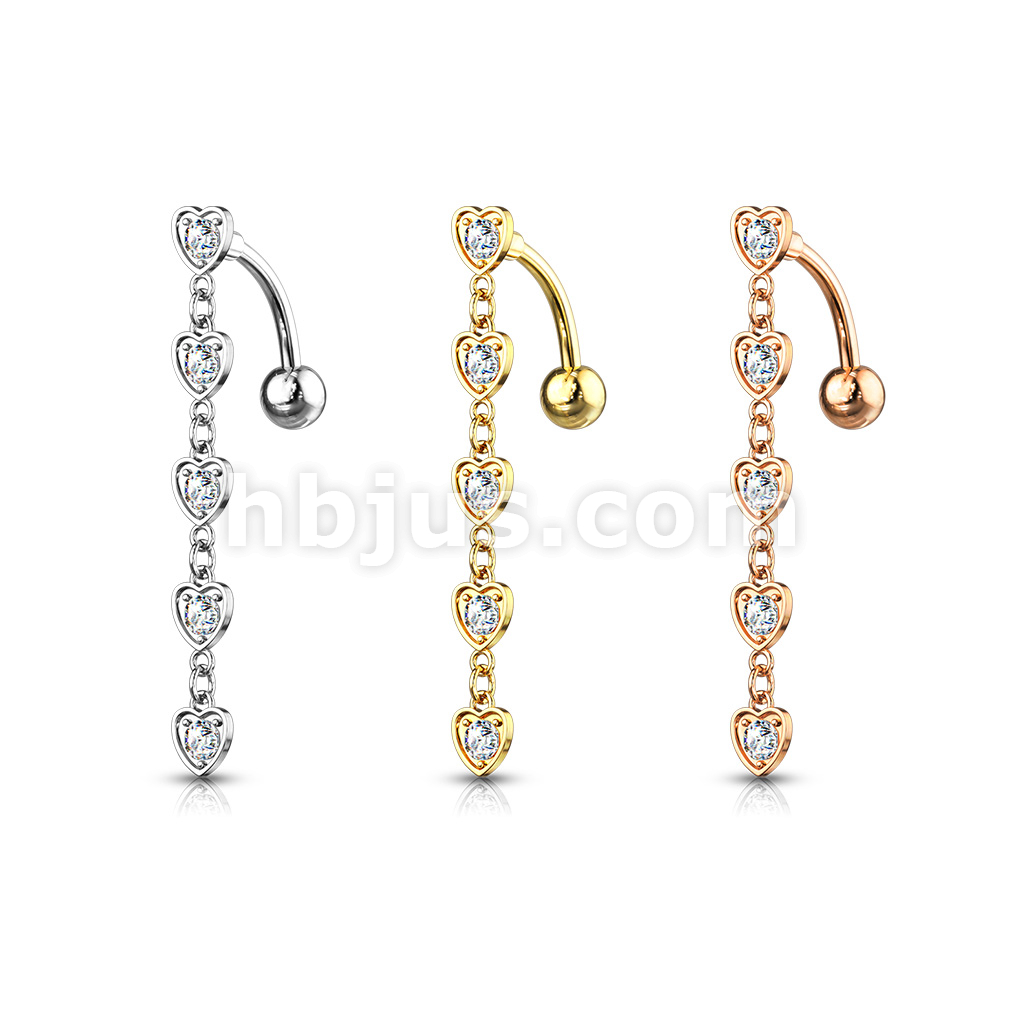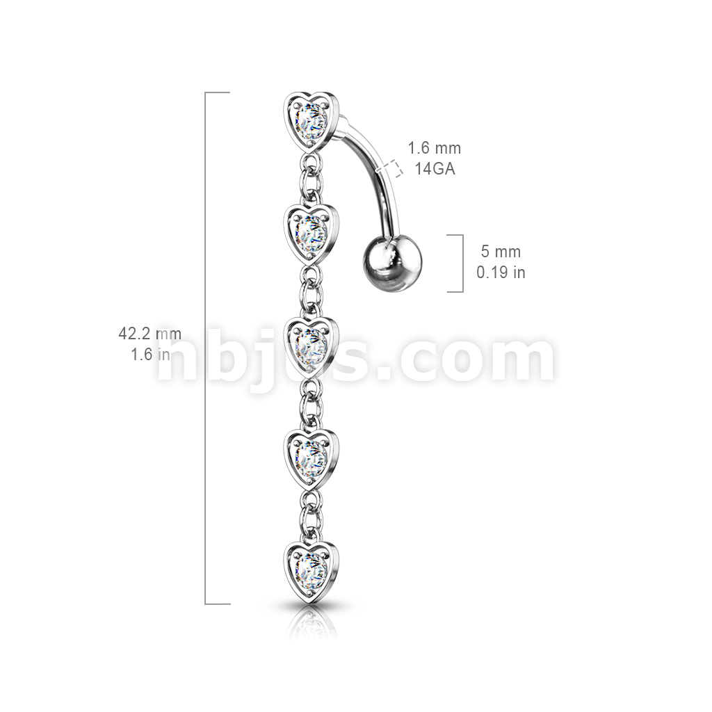 316L Surgical Steel 5 Crystal Set Center Hearts Dangle Top Drop Belly Button Ring