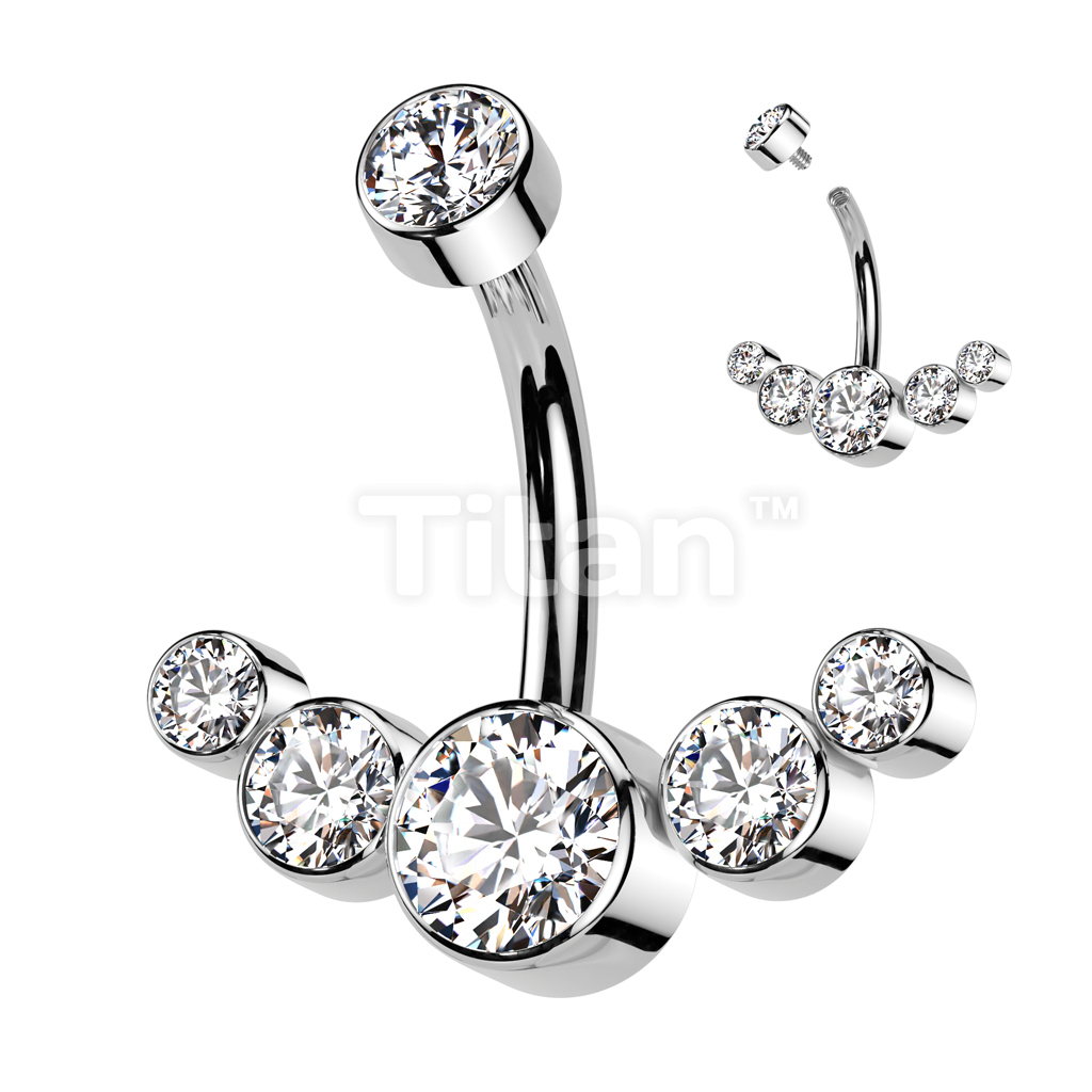 Implant Grade Titanium Internally Threaded CZ Bezel Set Top With 5-CZ Curved Line Belly Button Ring
