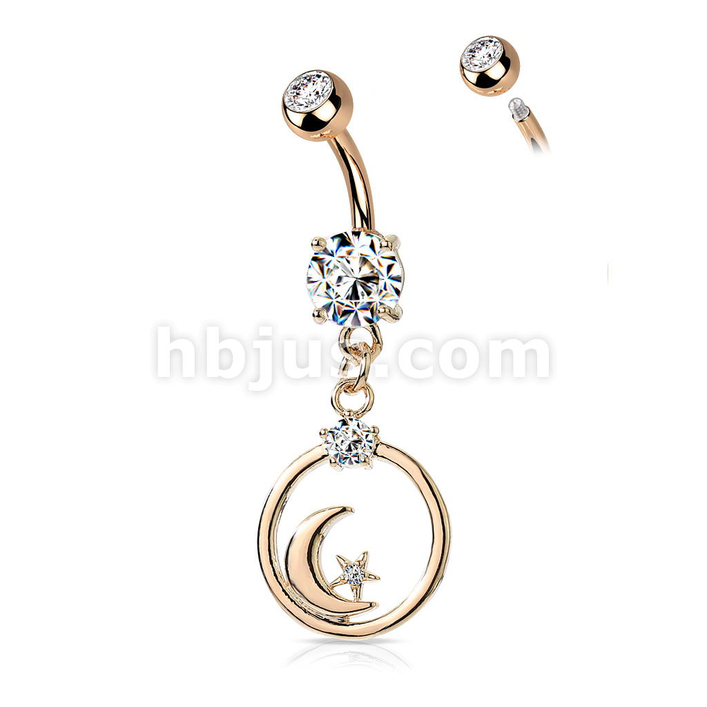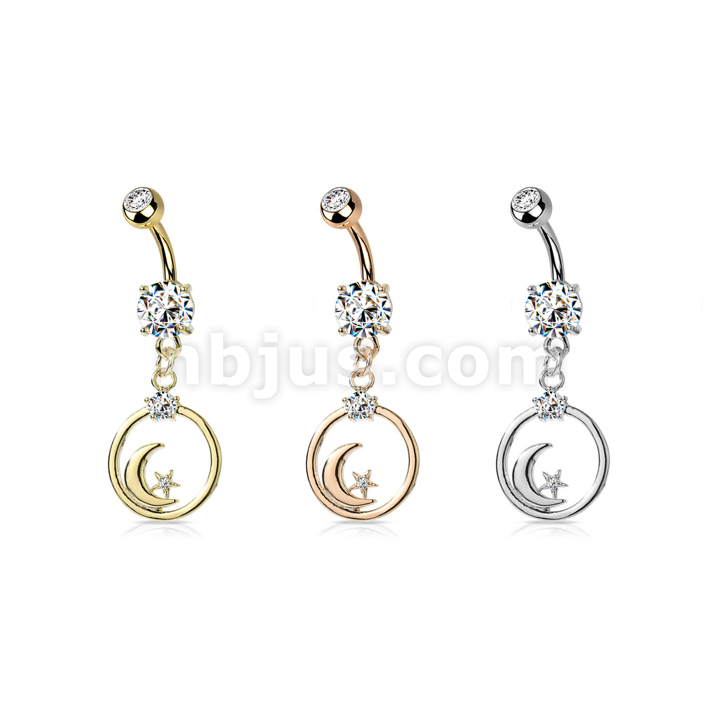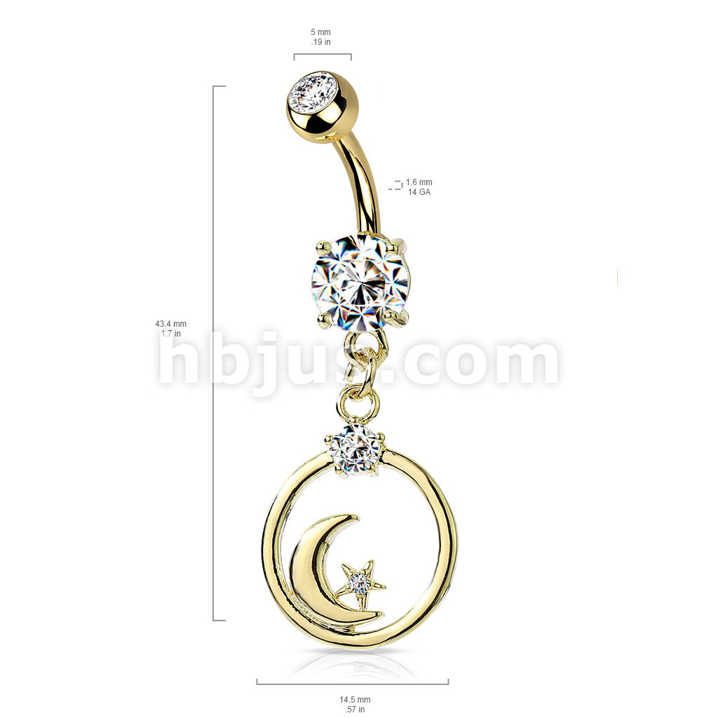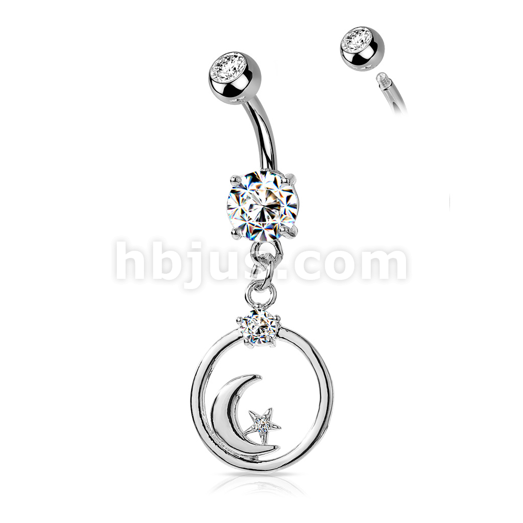 316L Surgical Steel Crescent Moon and CZ Star Dangle Encased in Circle Belly Button Ring