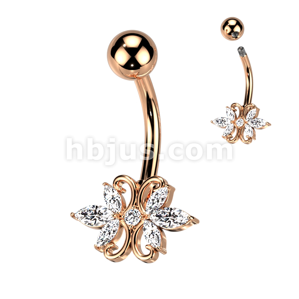 316L Surgical Steel Double Heart 3 Marquise CZ Belly Button Ring