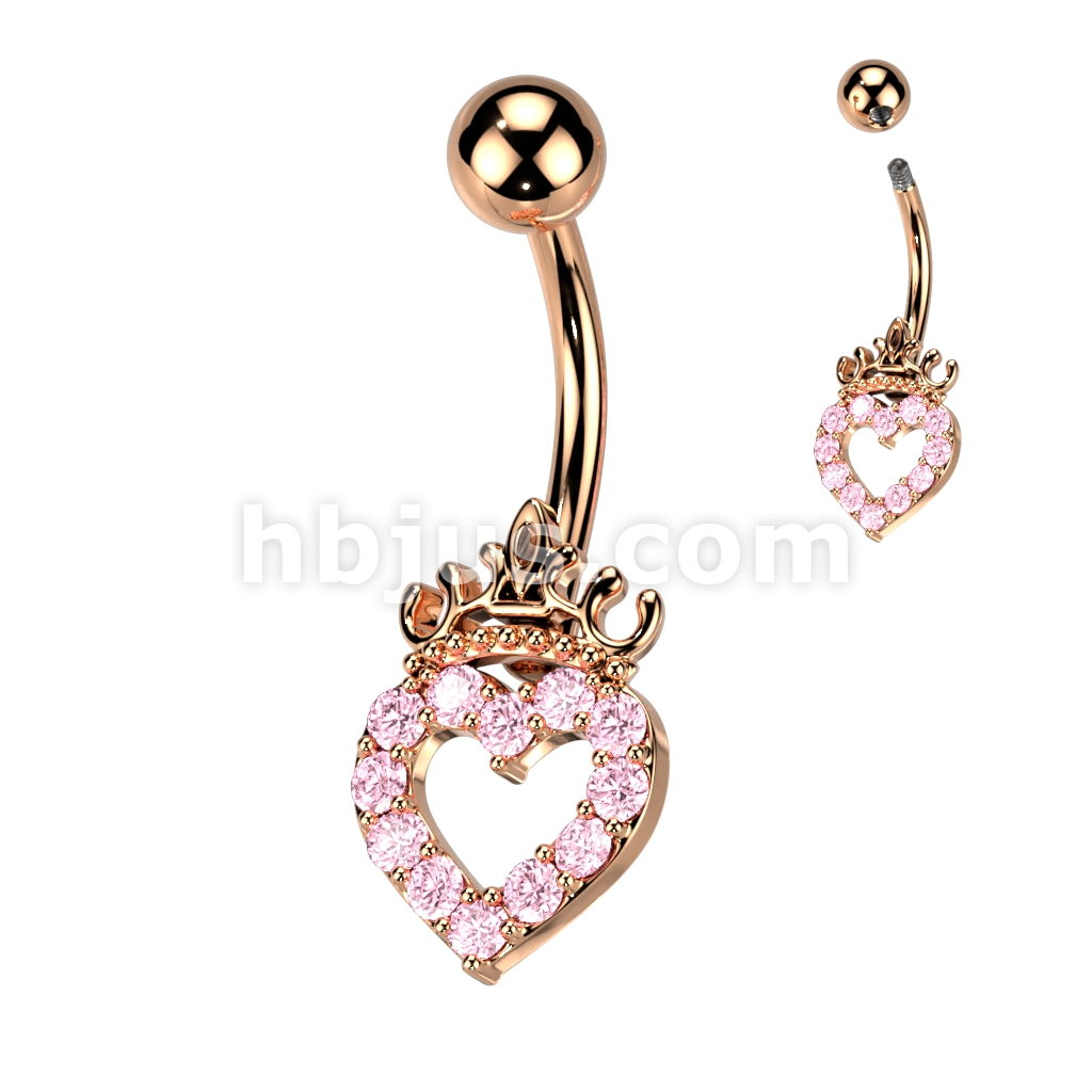 316L Surgical Steel CZ Paved Hollow Heart and Crown Belly Button Ring