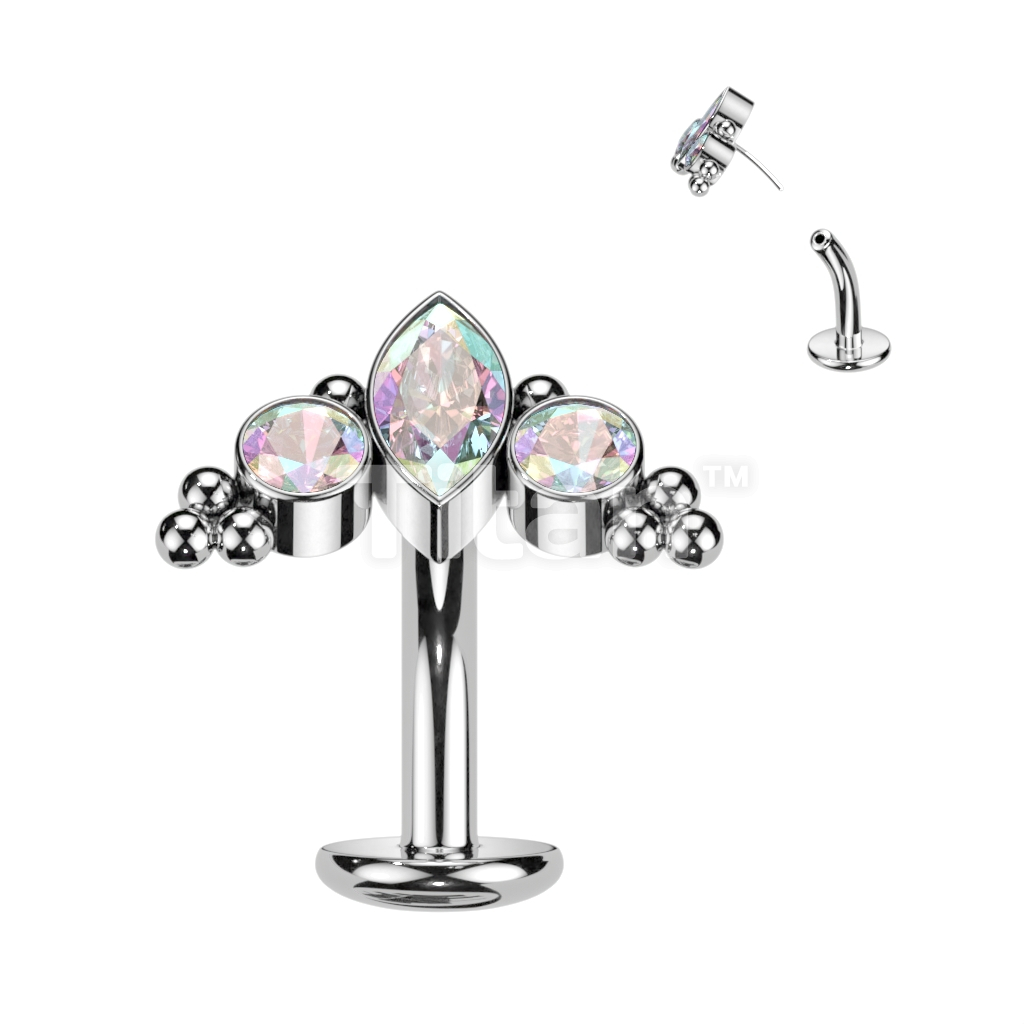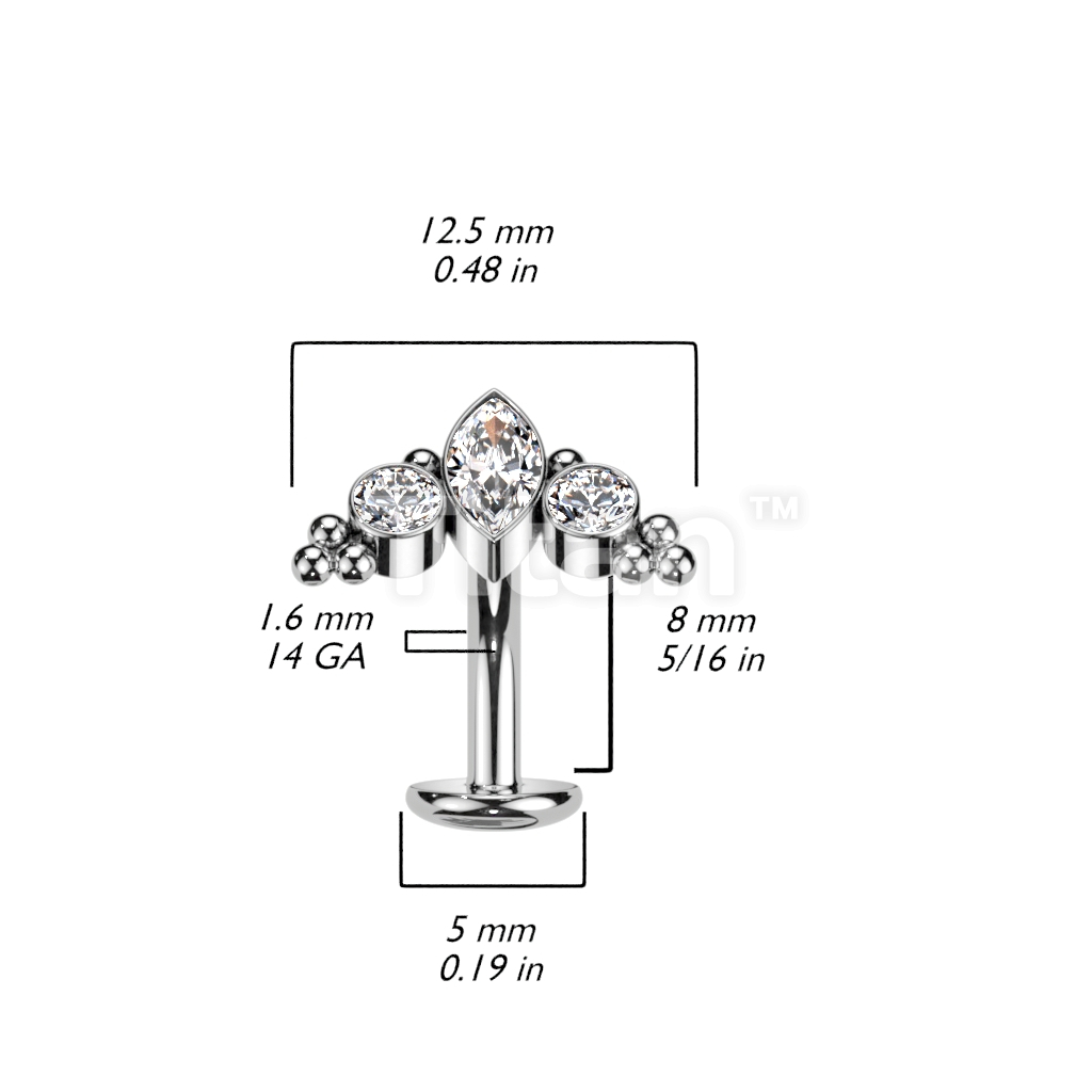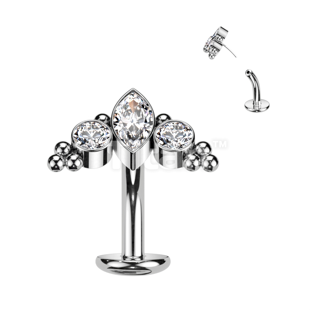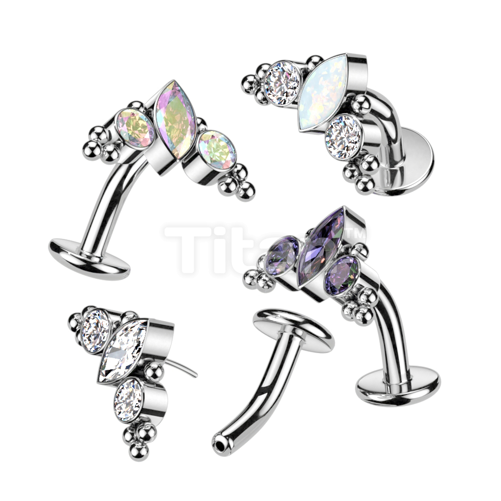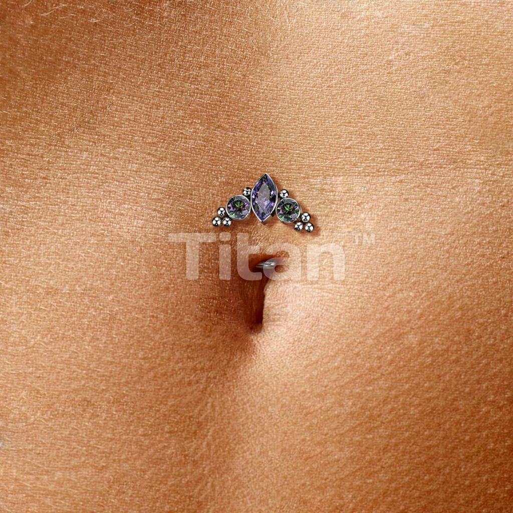 Implant Grade Titanium Threadless Floating Convex Base Belly Button Ring With Marquise CZ or Opal Center Surrounded by CZs and Ball Clusters Top