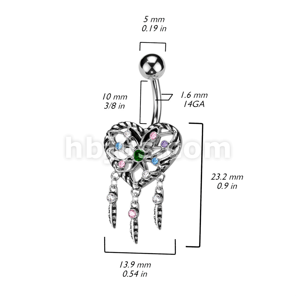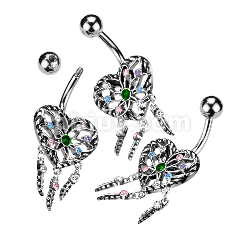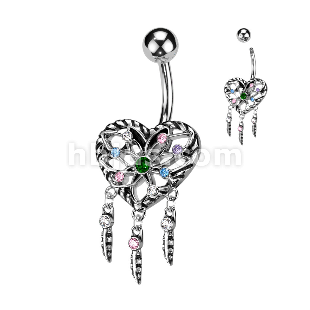 316L Surgical Steel Heart Dream Catcher With Multi Color CZ Belly Button Ring
