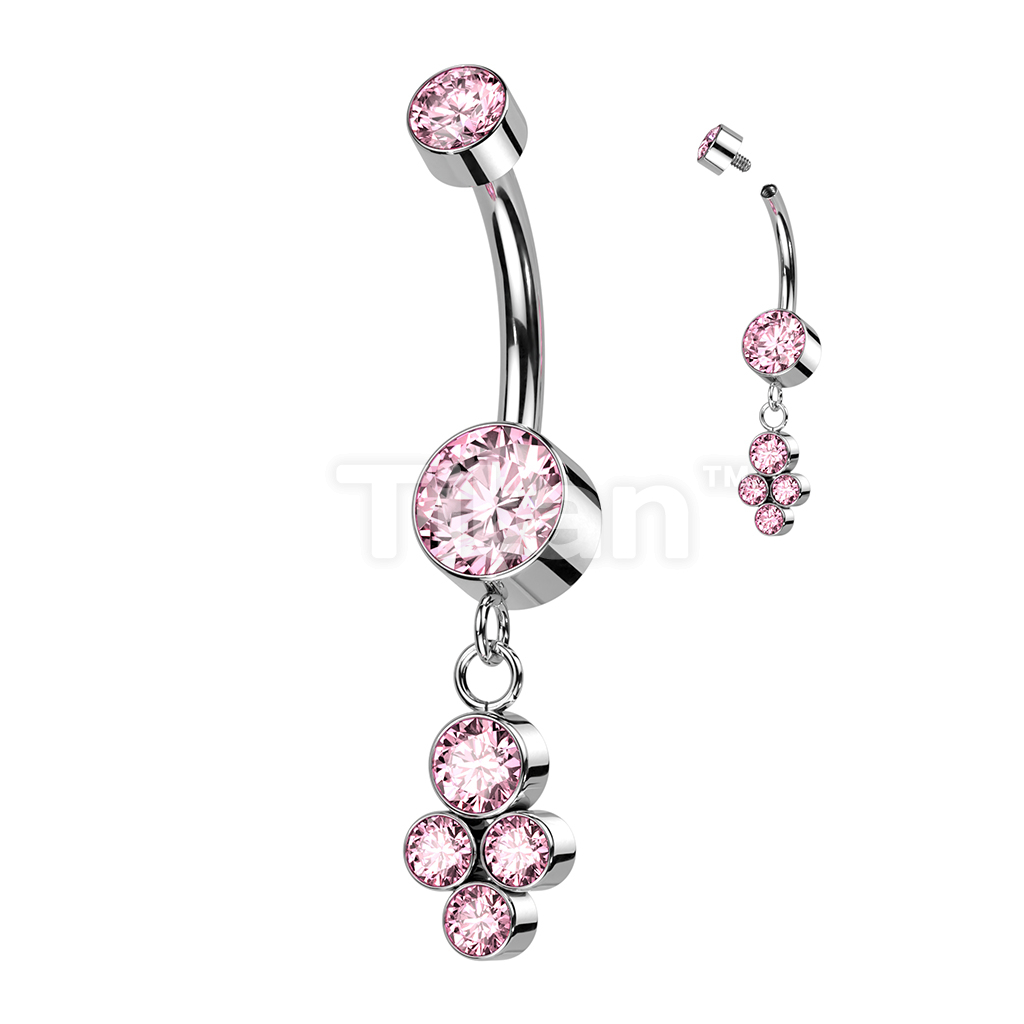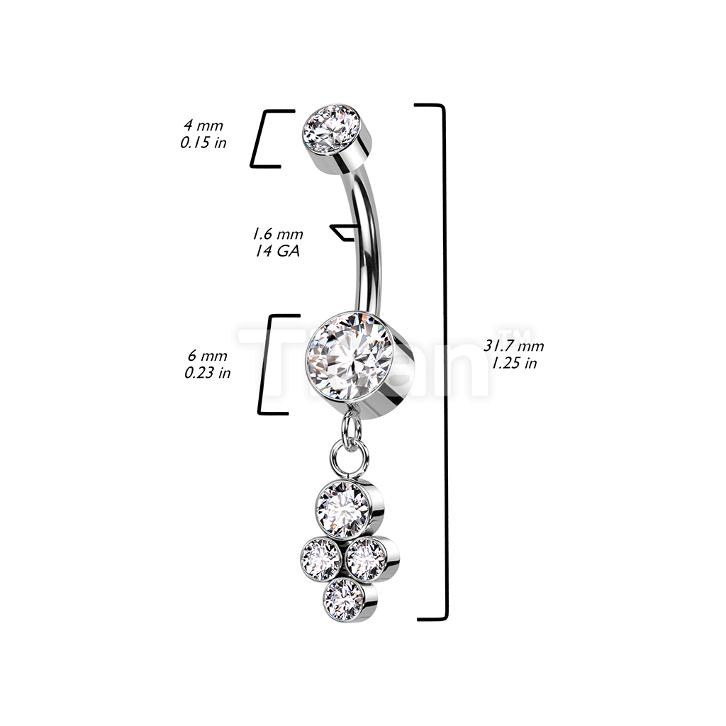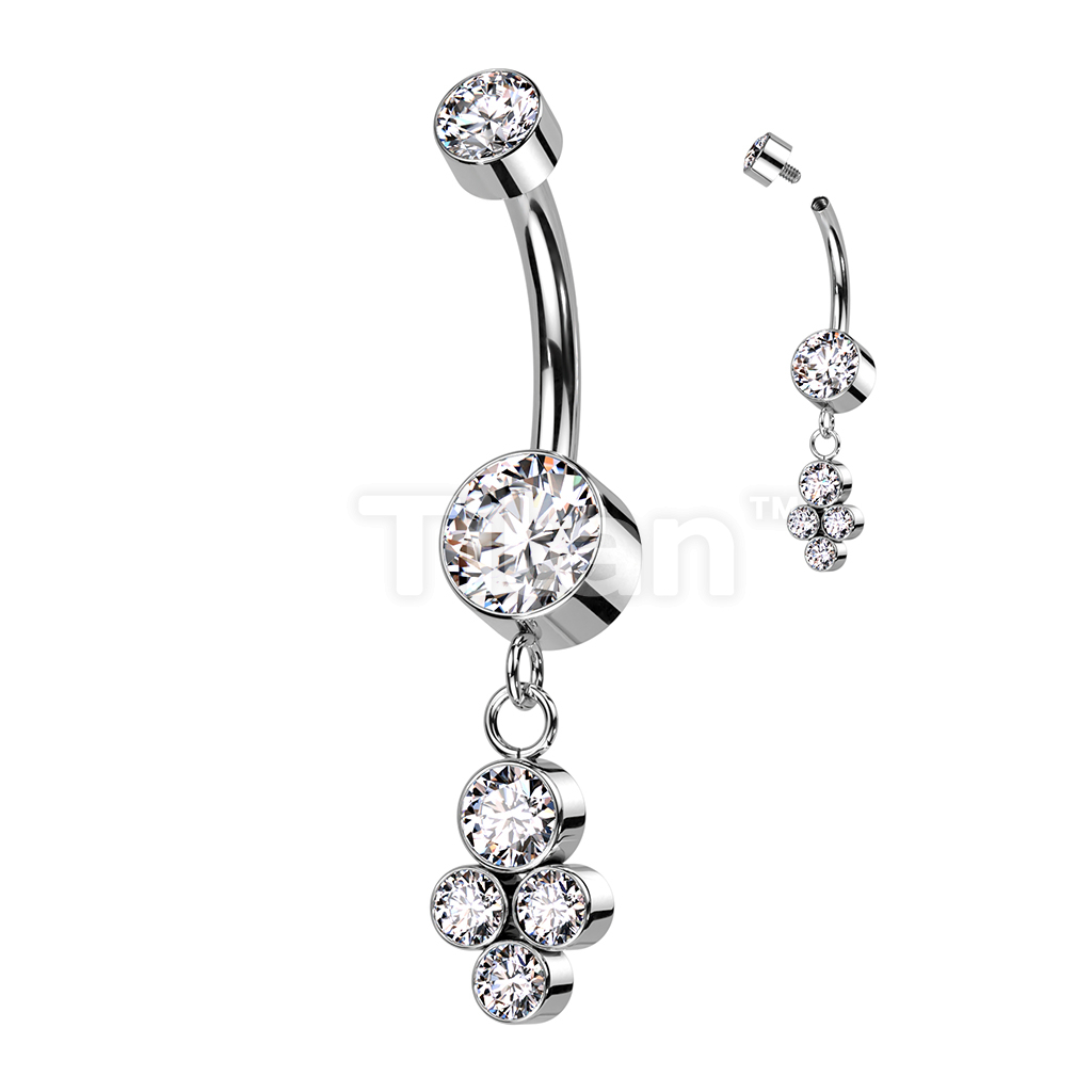 Implant Grade Titanium Internally Threaded Double Bezel Set CZ With Dangle Cluster of 4 Bezel Set CZ Belly Button Ring