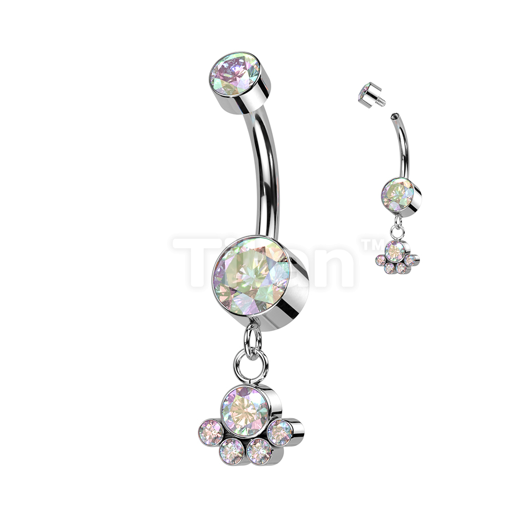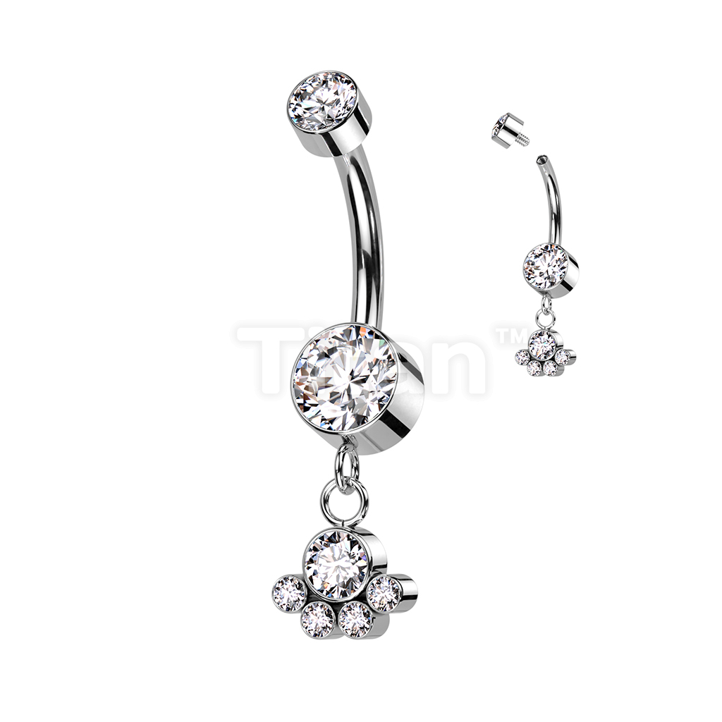 Implant Grade Titanium Internally Threaded Double Bezel Set CZ With Dangle Cluster of 5 Bezel Set CZ Belly Button Ring