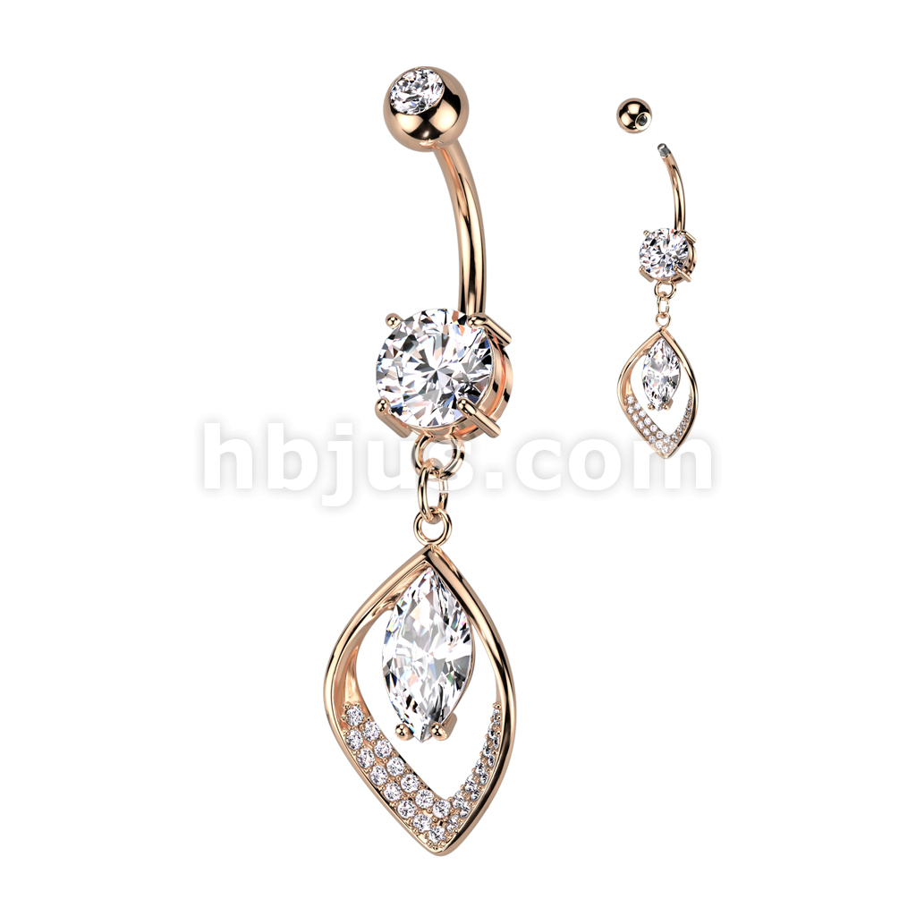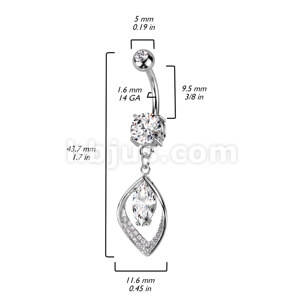 316L Surgical Steel Belly Ring With Hollow CZ Pave Leaf and Marquise CZ Center