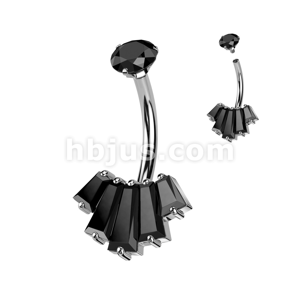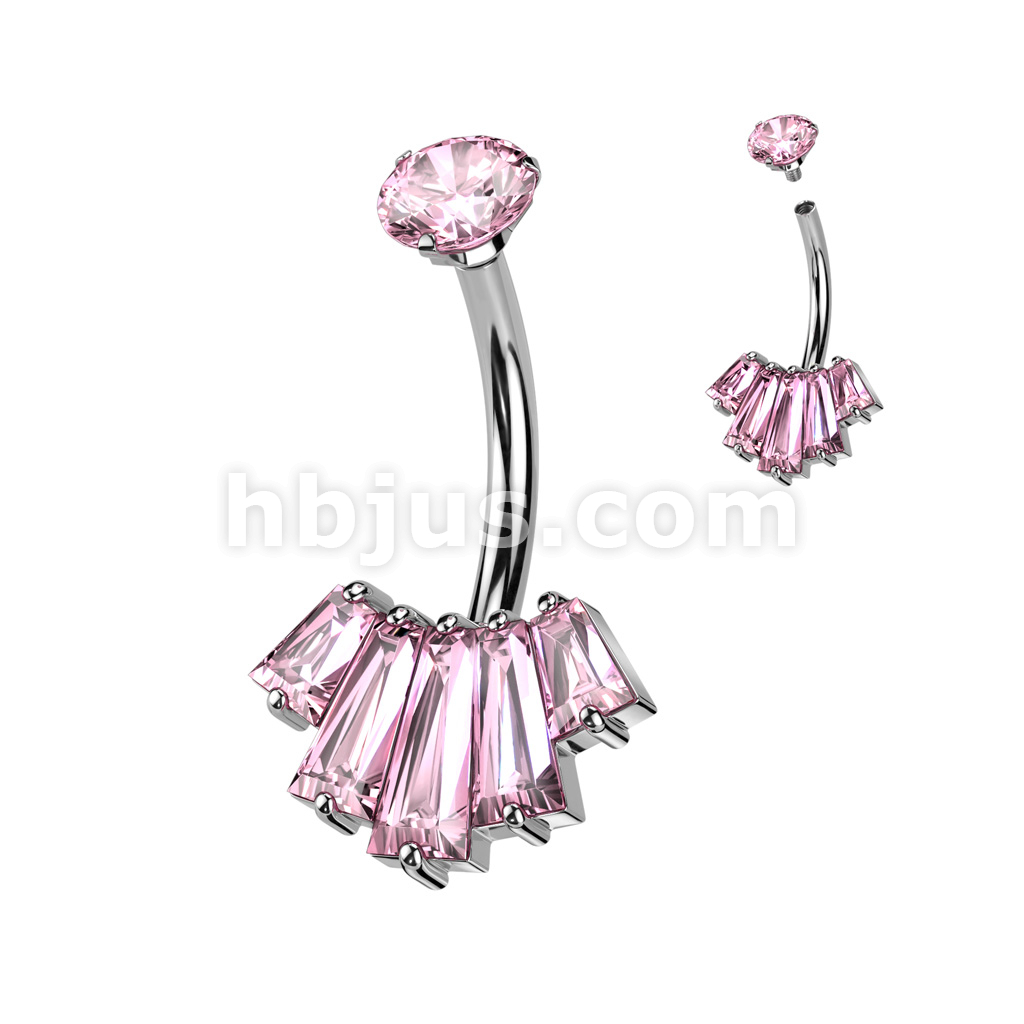 316L Surgical Steel Belly Ring With Internally Threaded Round CZ Top and 5 Baguette CZ Set Fan Bottom