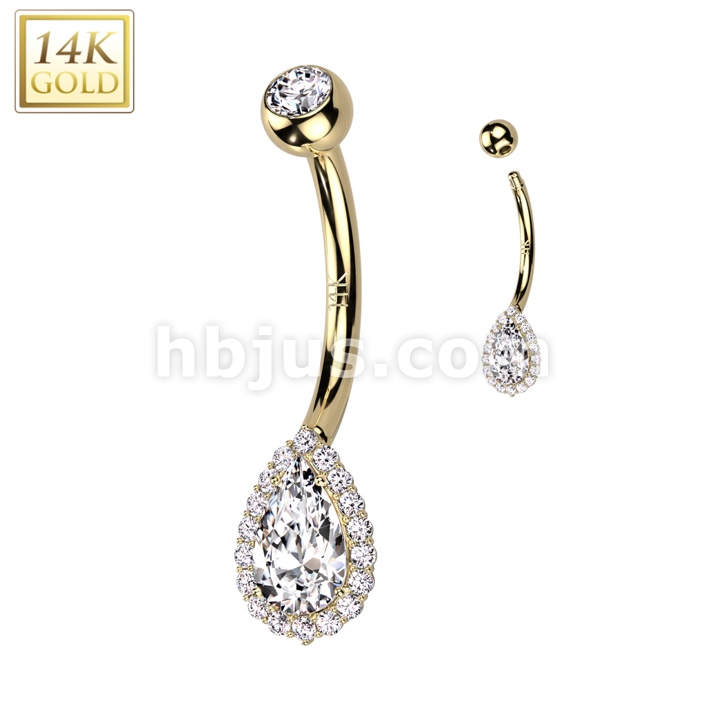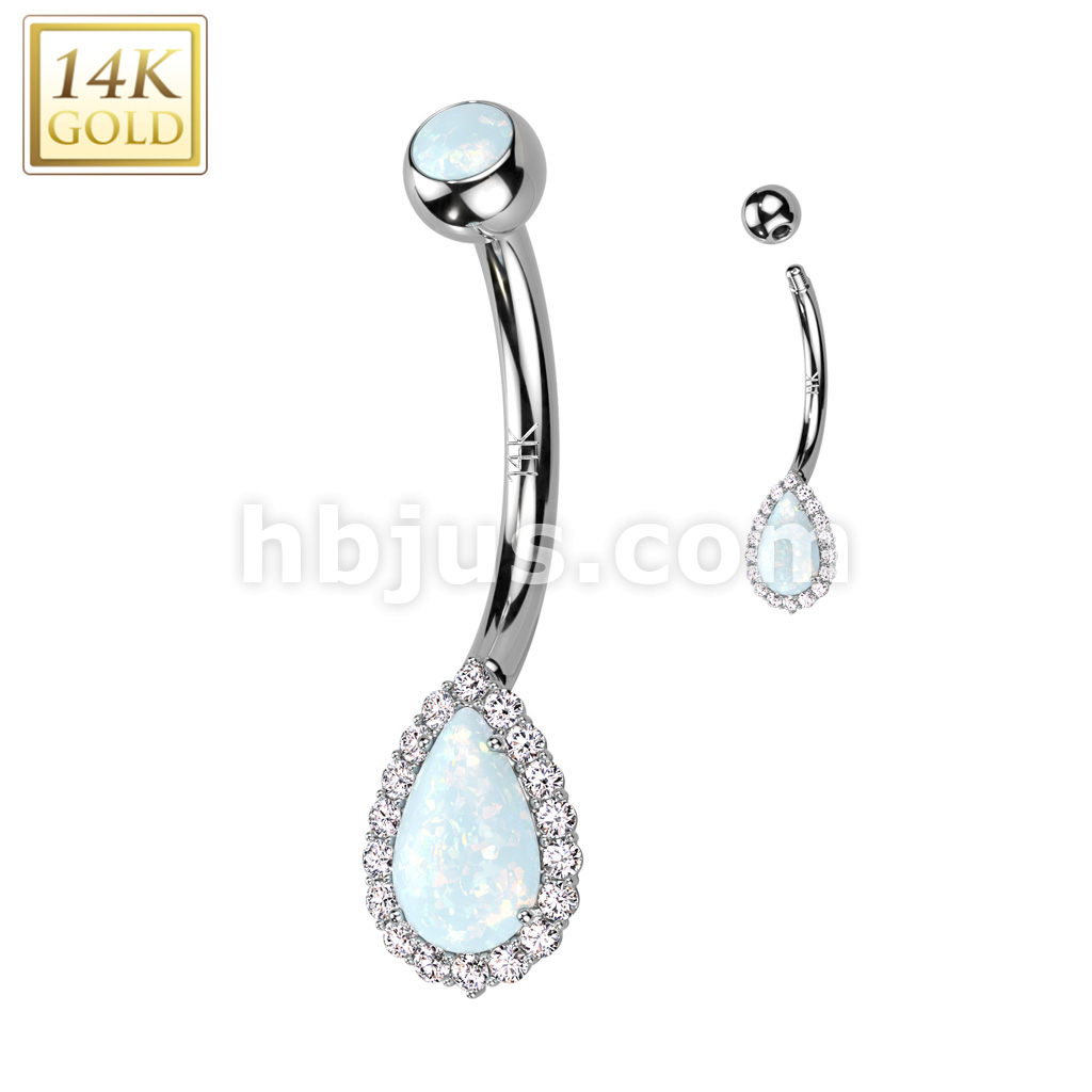 14K Gold Tear Drop With CZ Pave and Top and Center Opal or CZ Belly Button Navel Ring