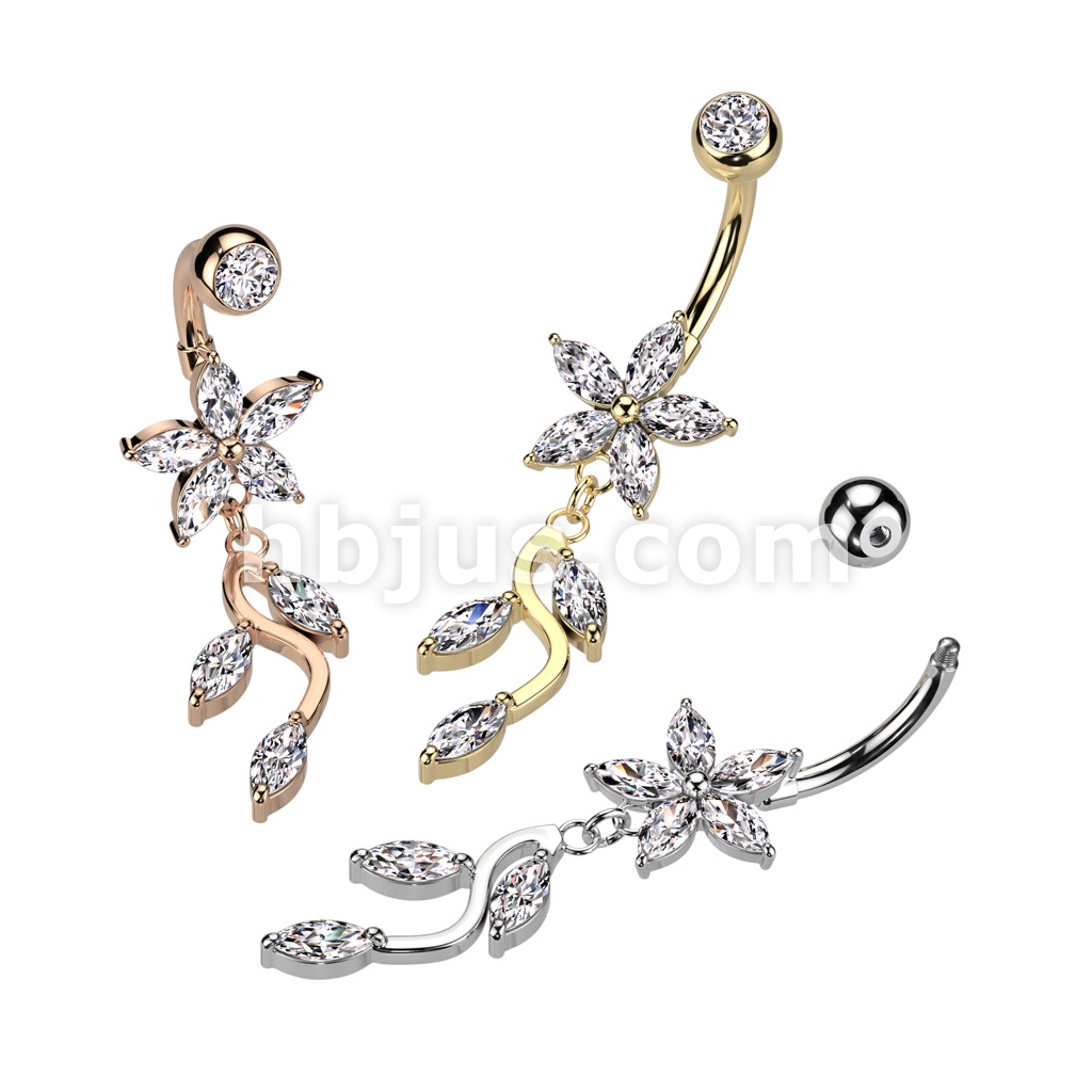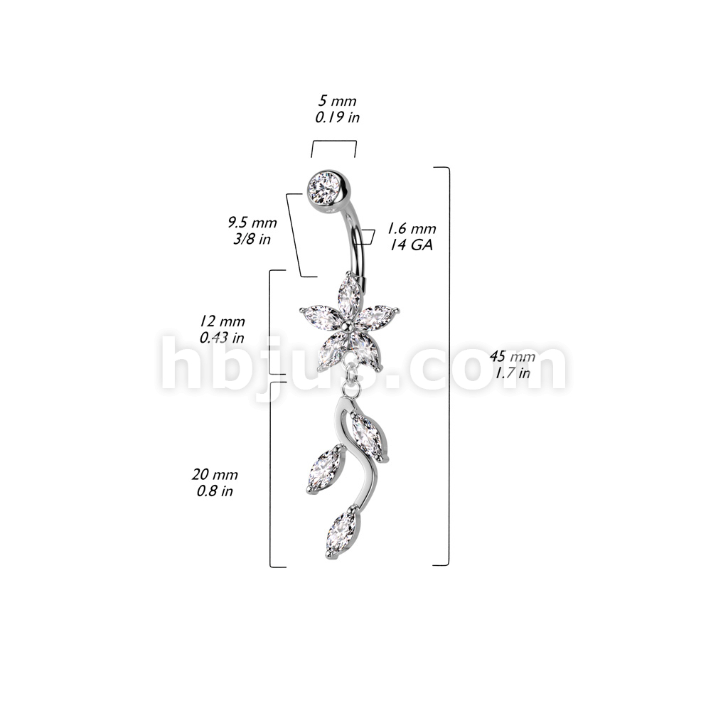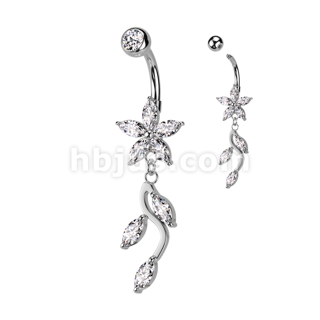 316L Surgical Steel 5 Marquise CZ Flower With Vine Dangle Belly Button Ring