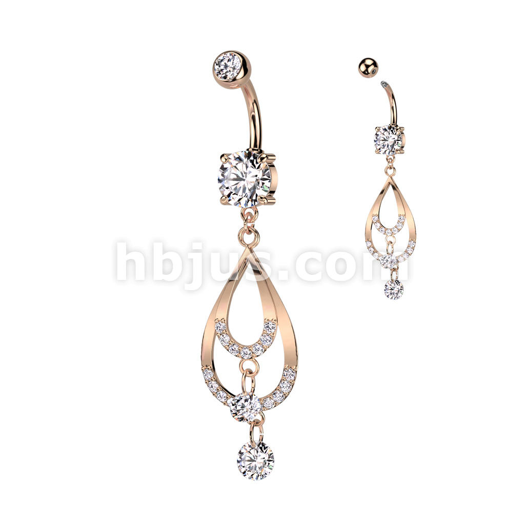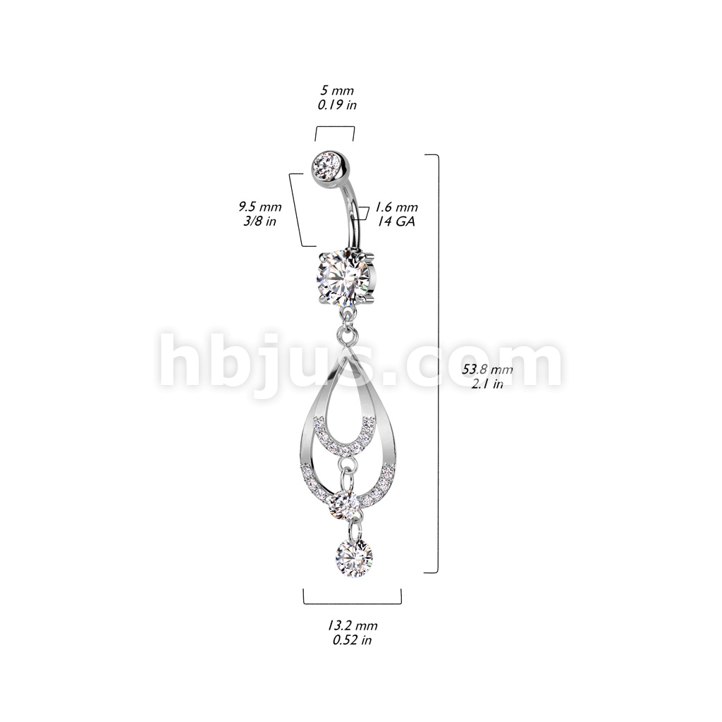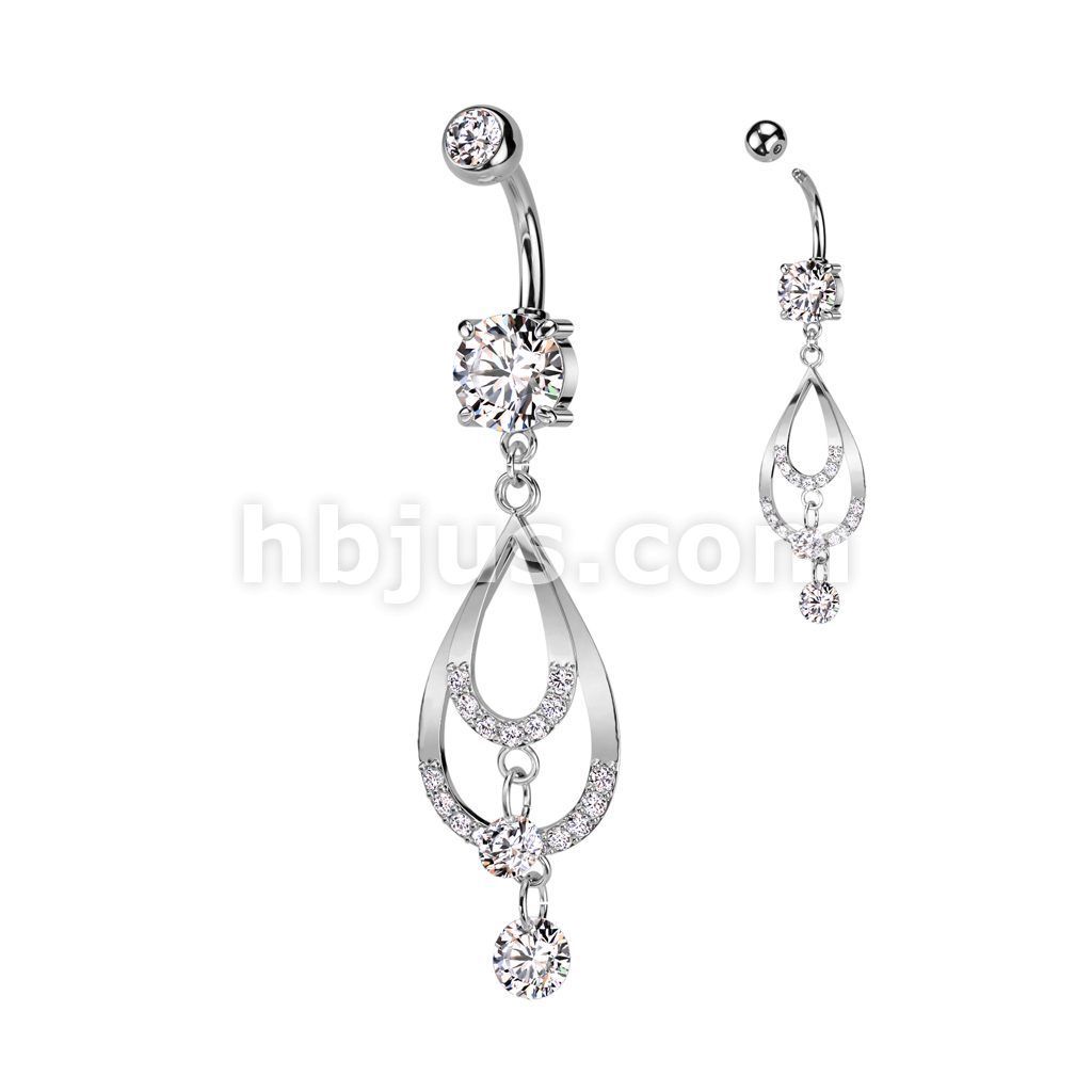 316L Surgical Steel Double CZ Pave Tear Drop With CZ Dangle Belly Button Ring