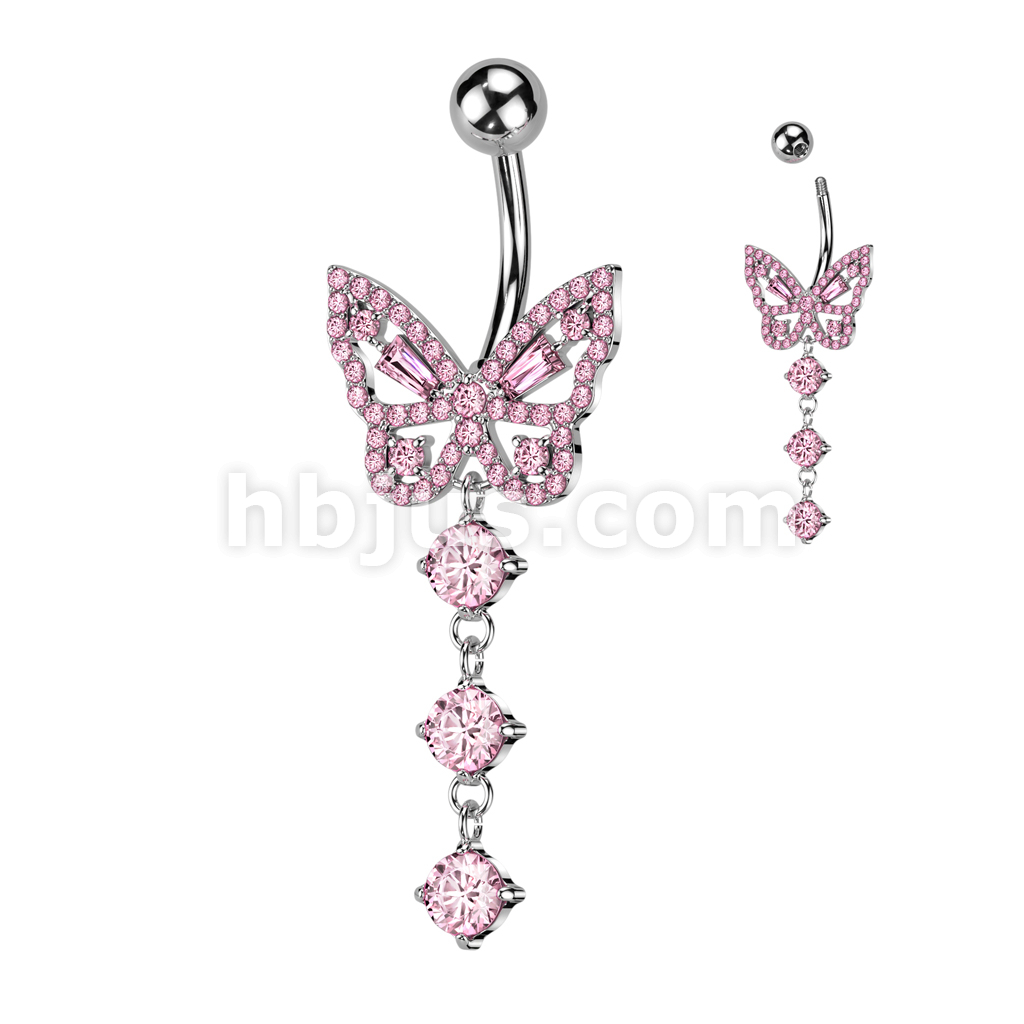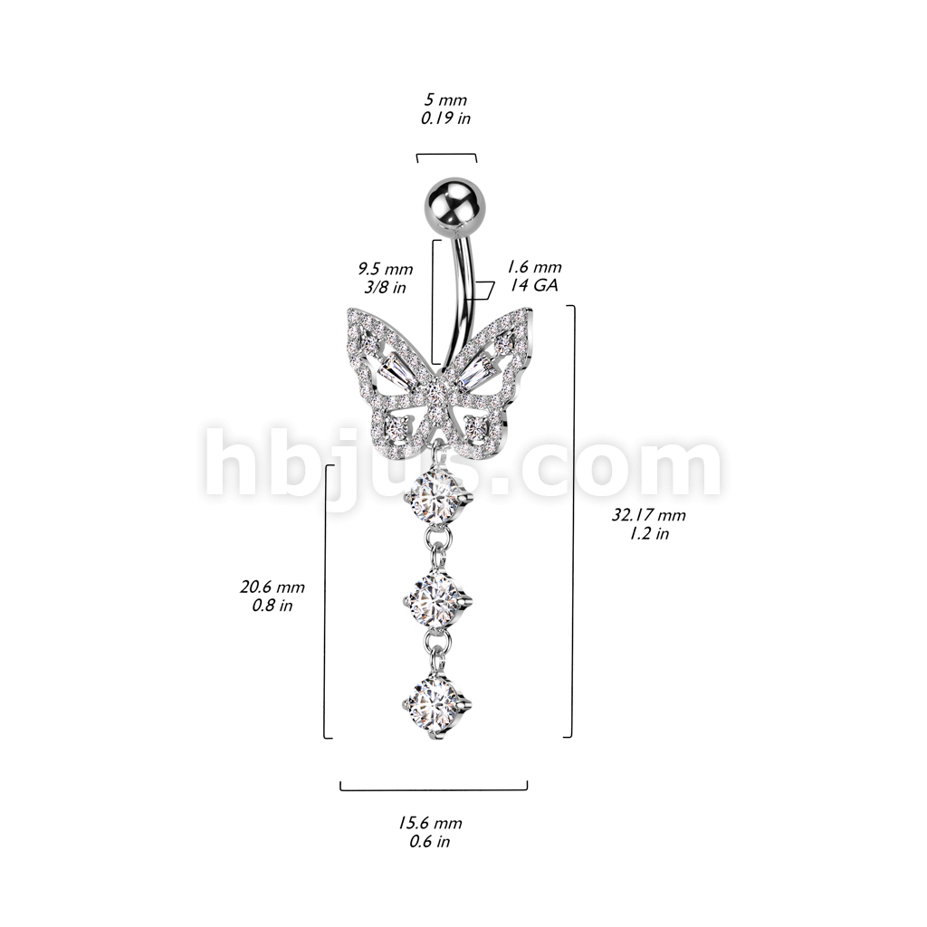 316L Surgical Steel CZ Butterfly With 3 Round CZ Dangle Belly Button Ring