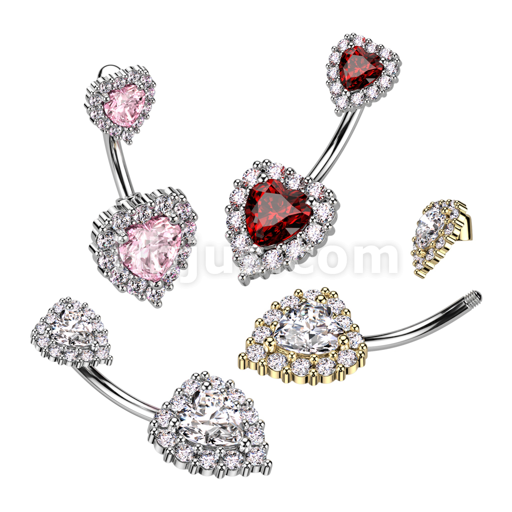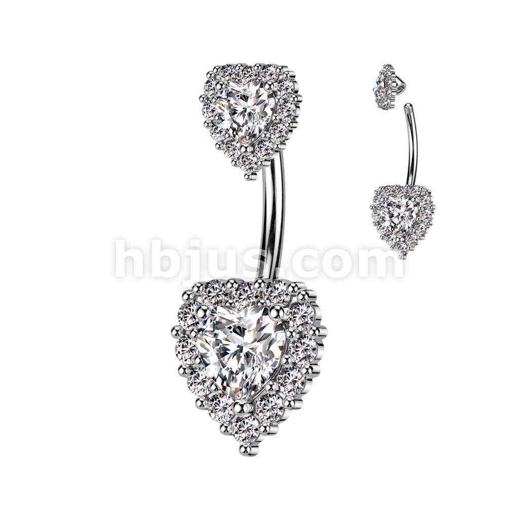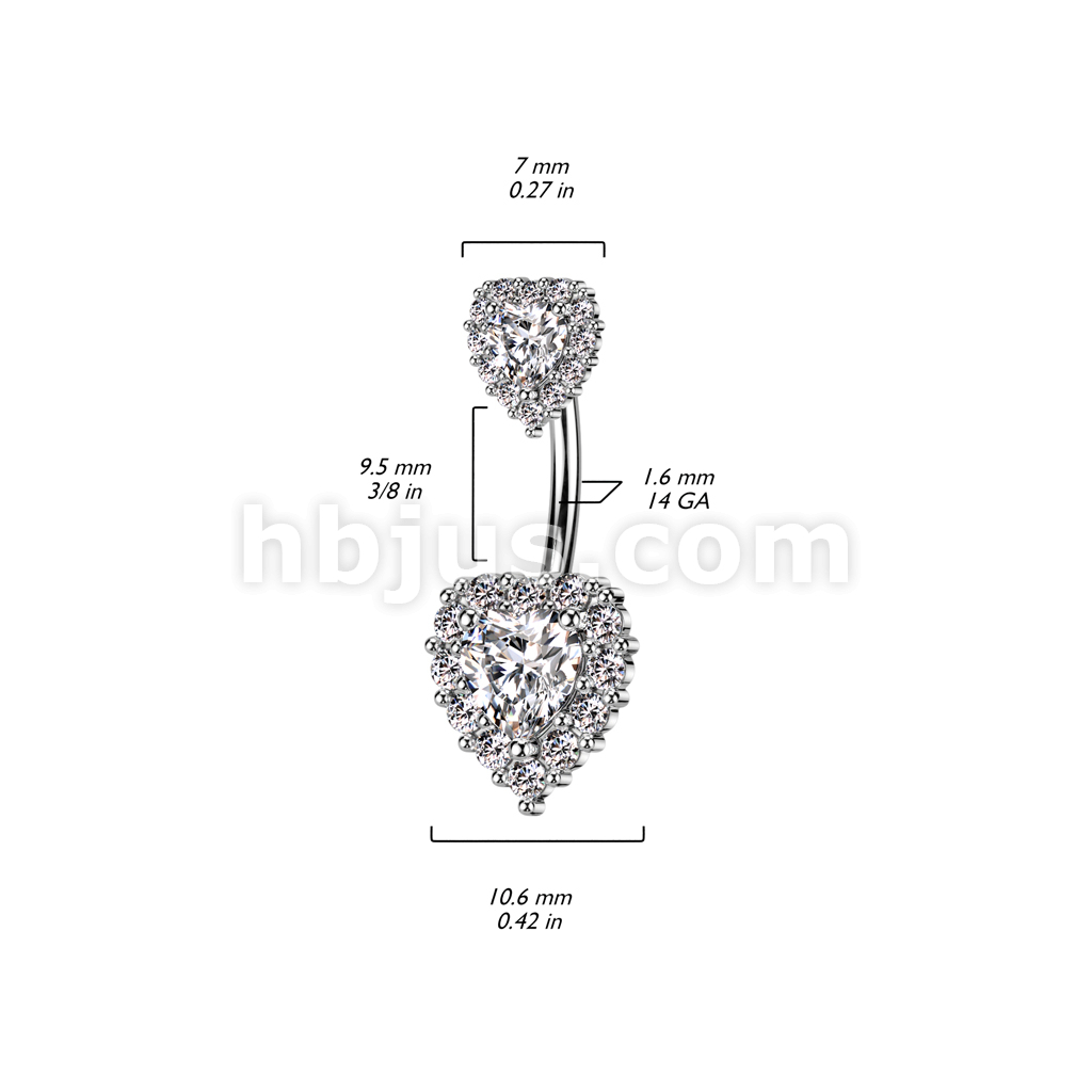 316L Surgical Steel Double Heart CZ Belly Button Ring With CZ Pave Around the Hearts