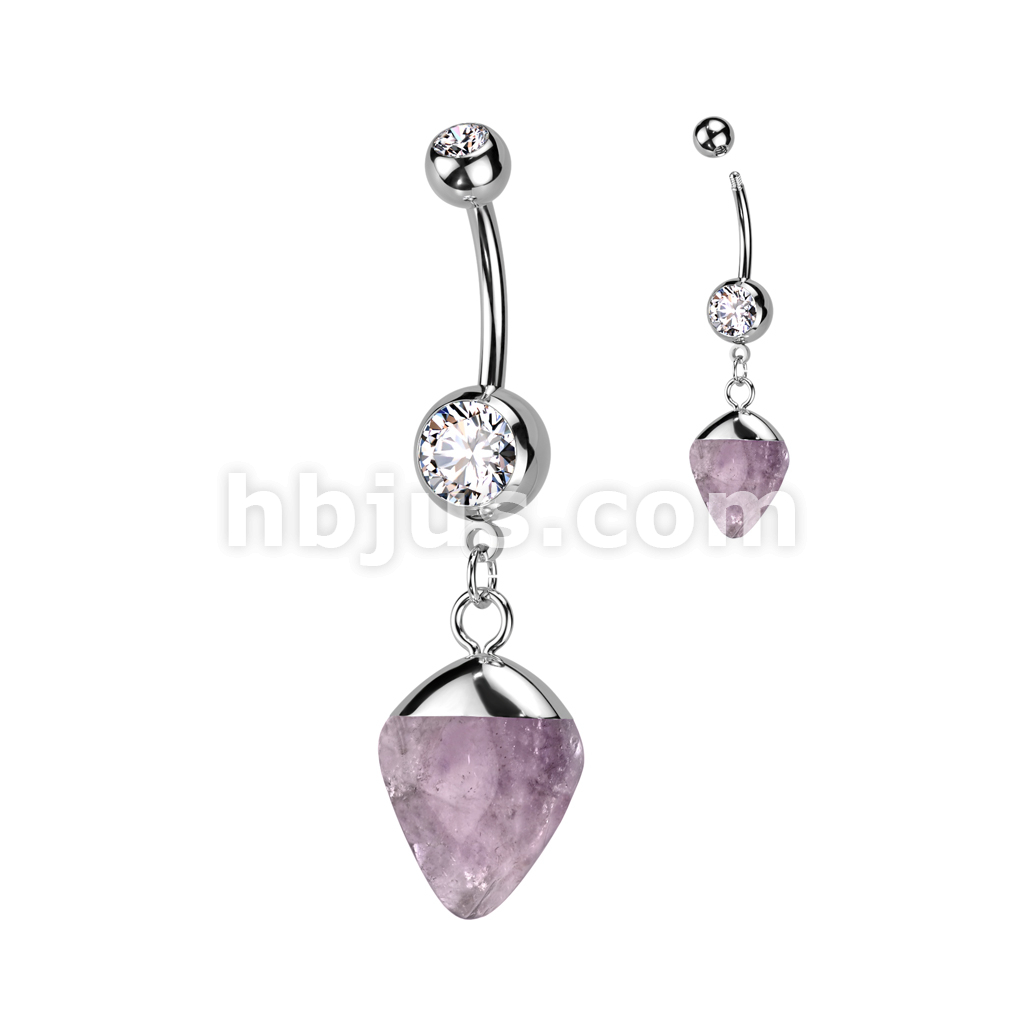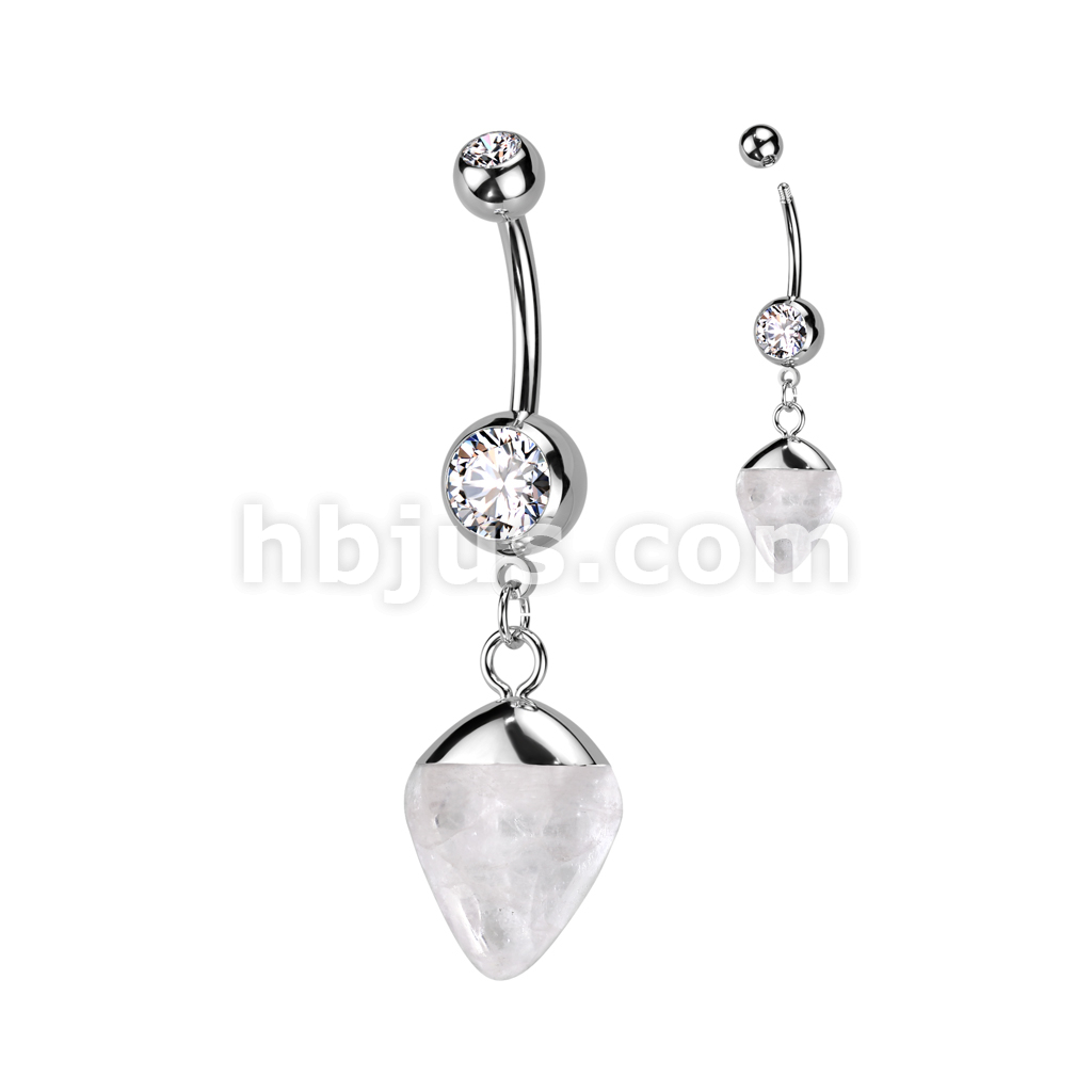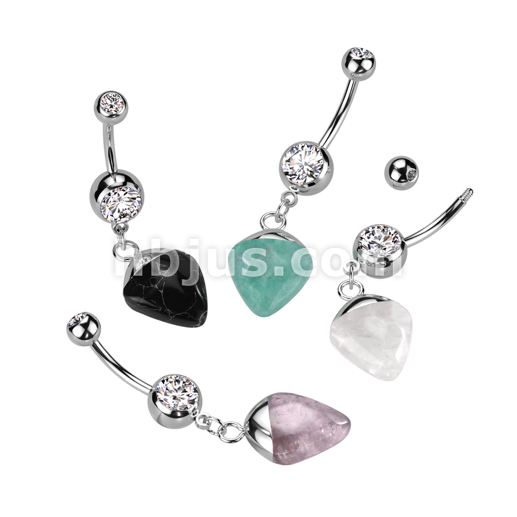 Double Jeweled 316L Surgical Steel Belly Button Navel Ring With Semi Precious Stone Dangle