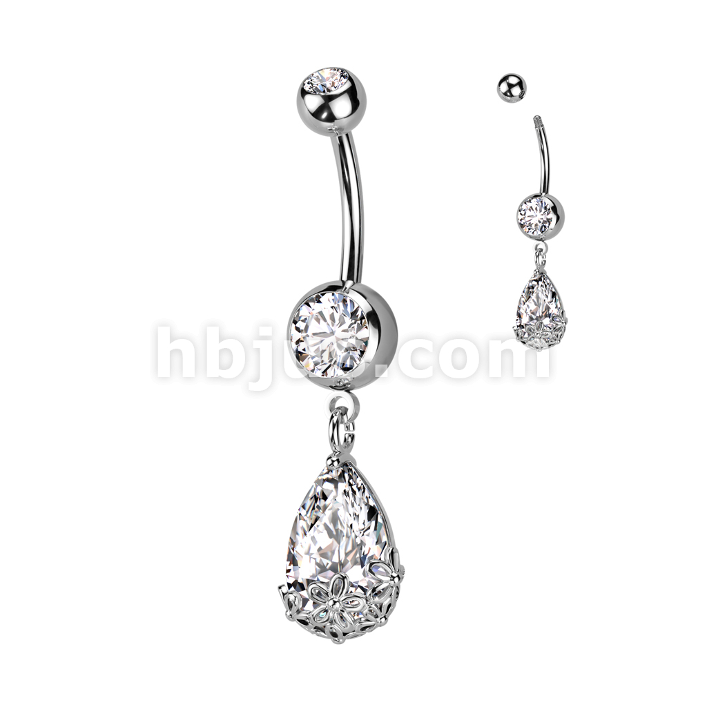 316L Surgical Steel Double Jeweled CZ With Pear CZ Floral Prong Set Dangle Belly Button Ring