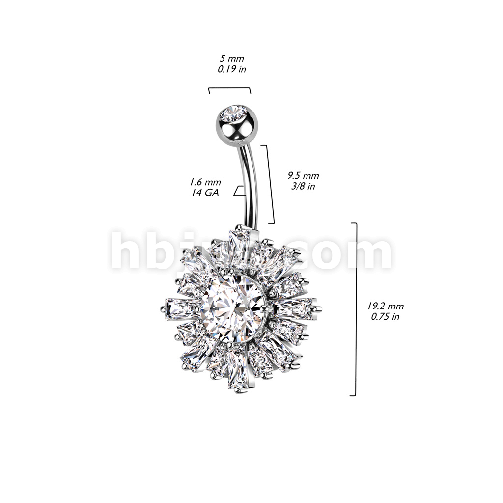 316L Surgical Steel Belly Ring With Sunburst Baguette CZ's Around a Prong Set CZ Center