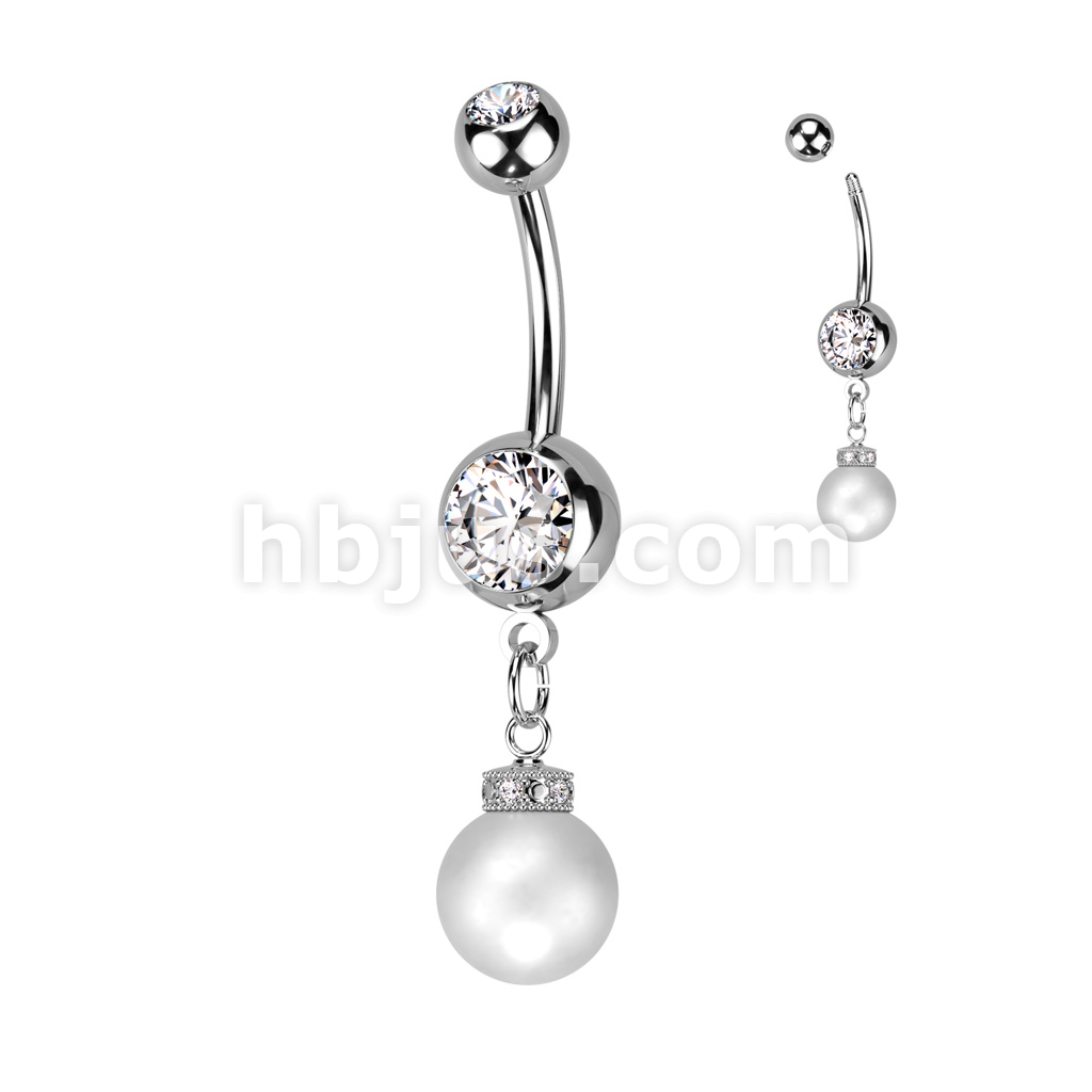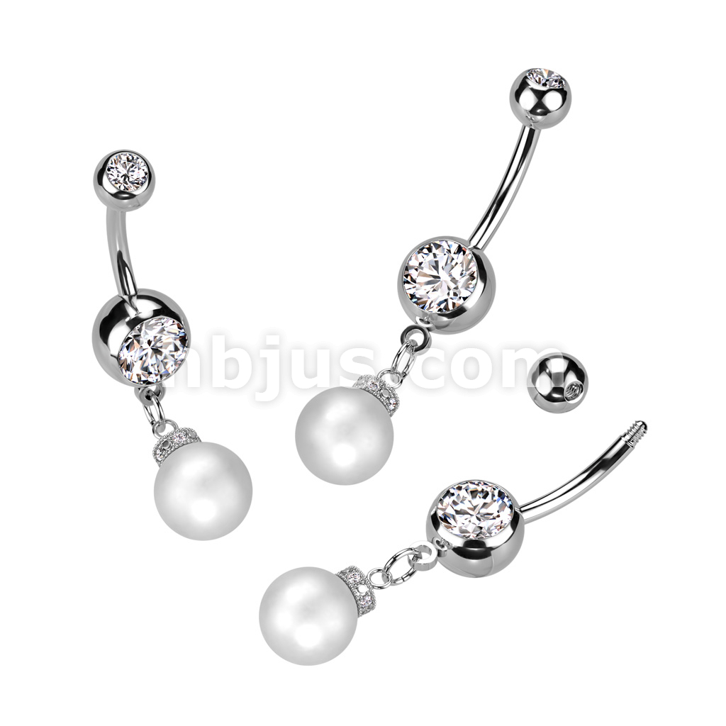 316L Surgical Steel Double Jeweled Gem With Pearl Dangle Belly Button Ring