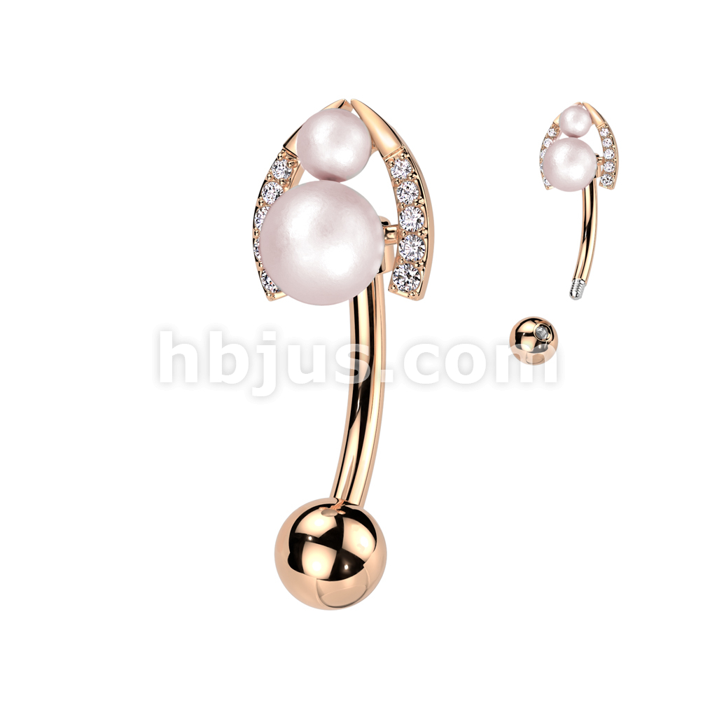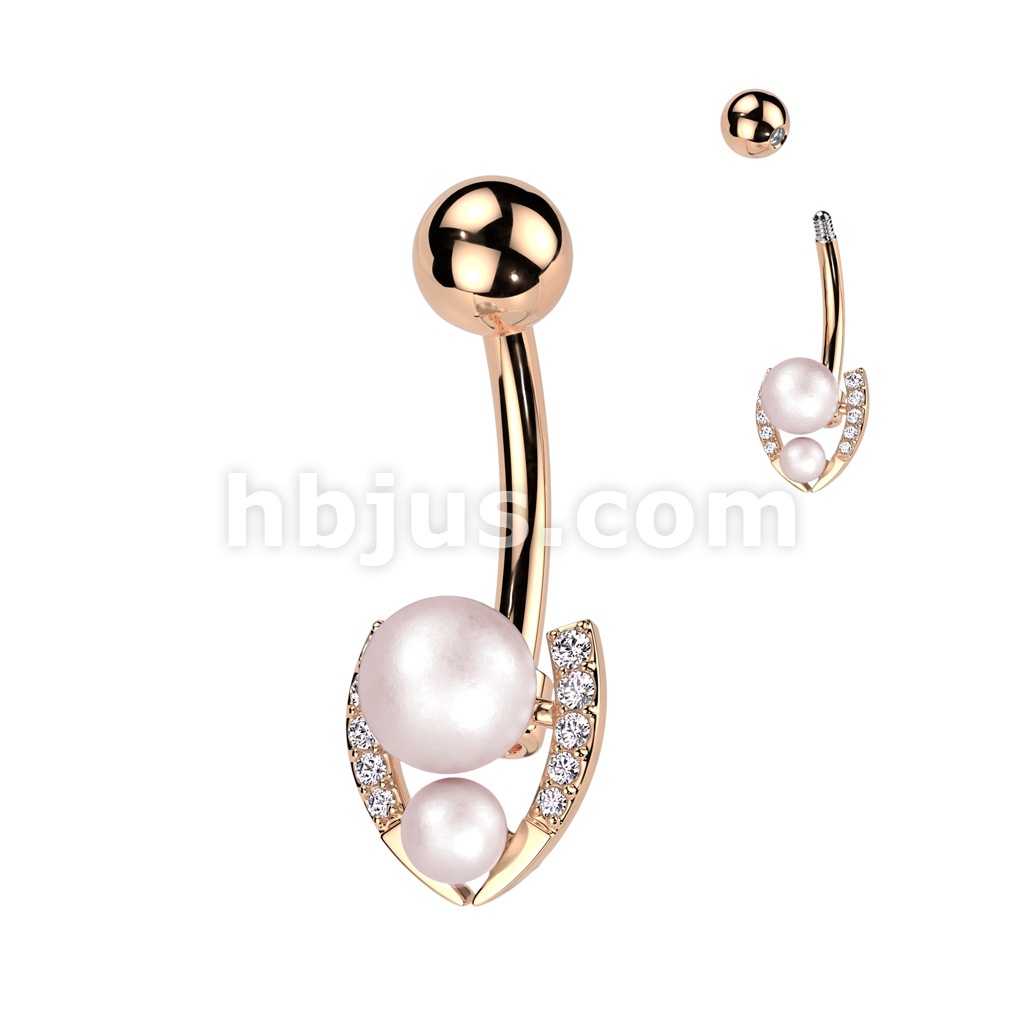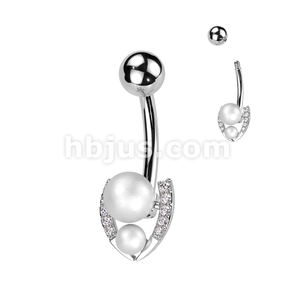316L Surgical Steel Belly Ring With Double Pearl and Pave CZ Horseshoe