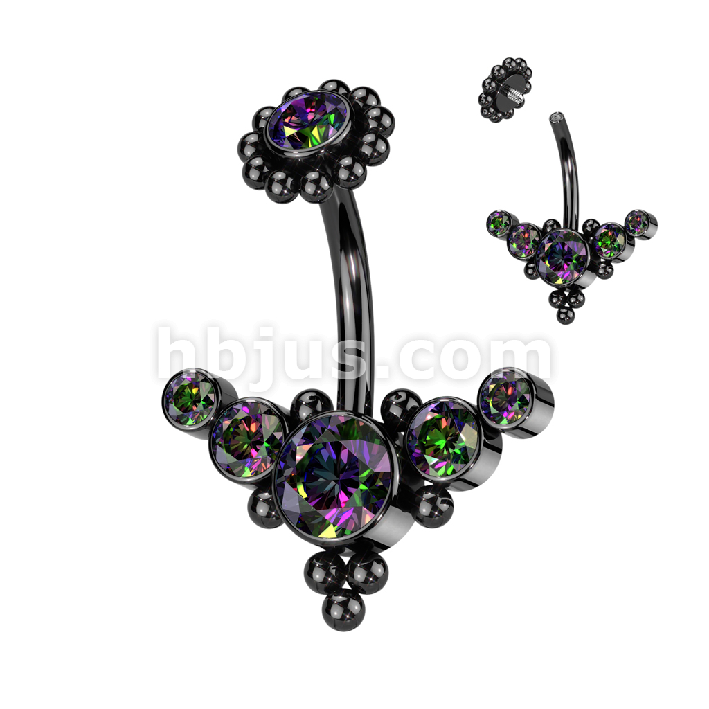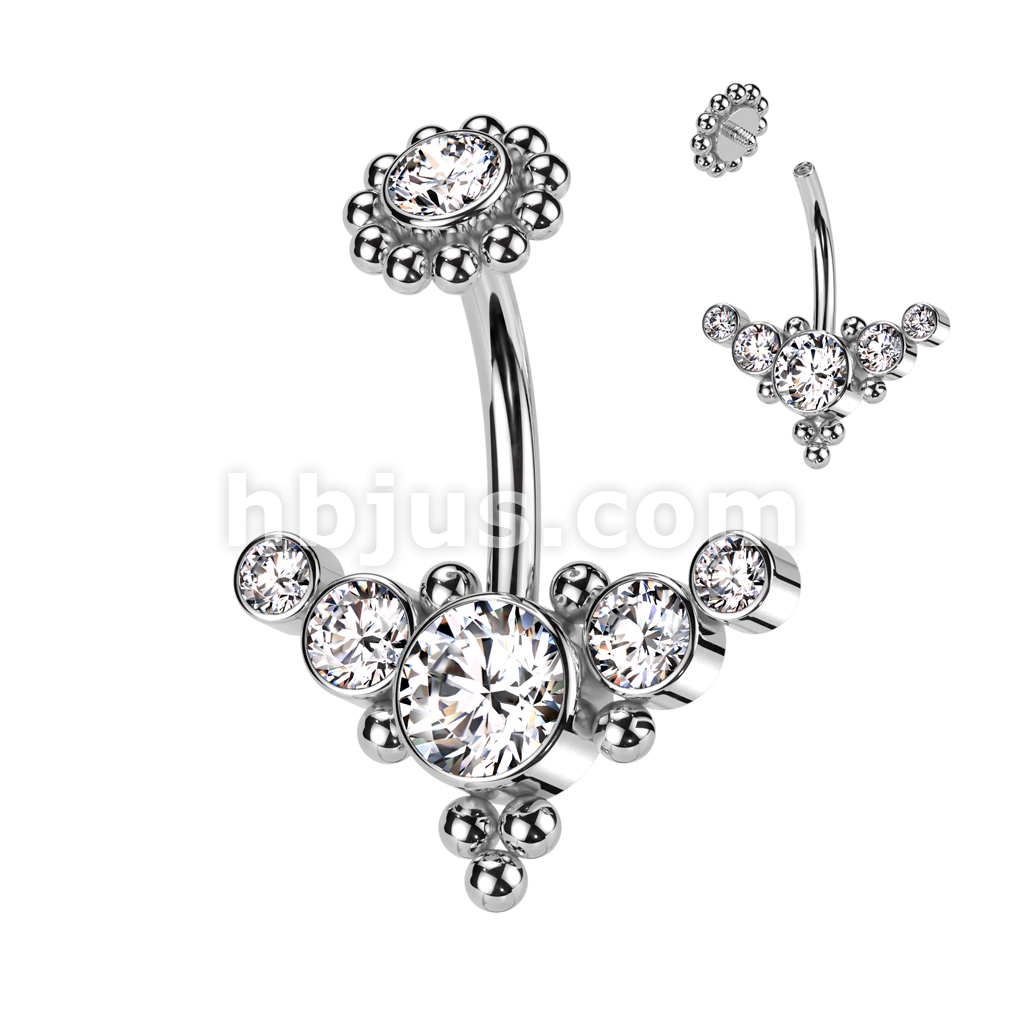 5 Round Bezel Set CZ Curved With Ball Cluster and Bezel Set CZ Center and Beaded Ball Edge Top Internally Threaded 316L Surgical Steel Belly Ring