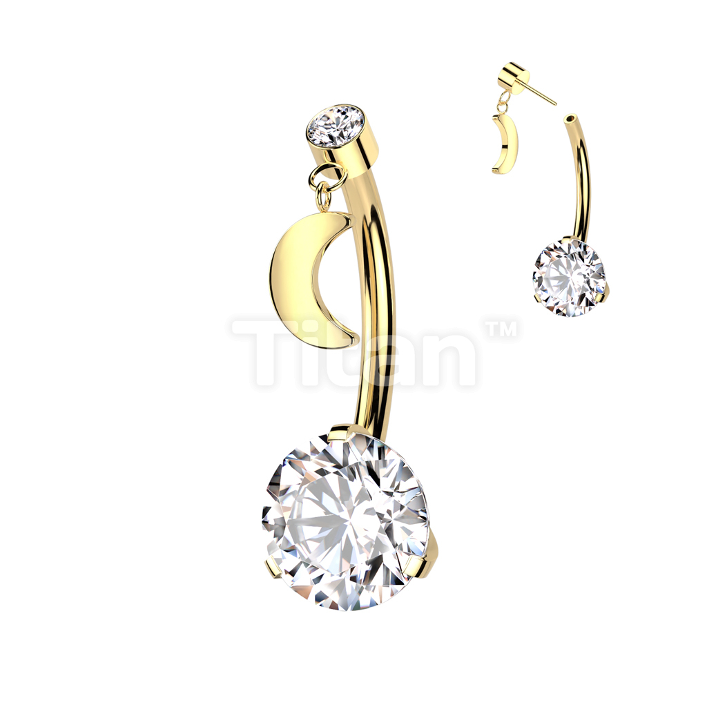 Implant Grade Titanium Threadless Push In Prong Set Bottom With Round Bezel Set CZ and Crescent Moon Dangle Top Belly Button Ring