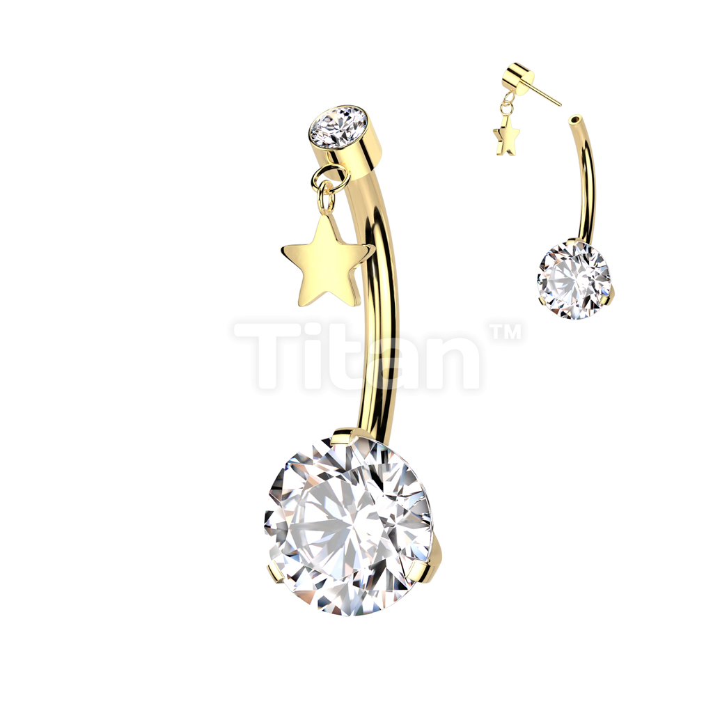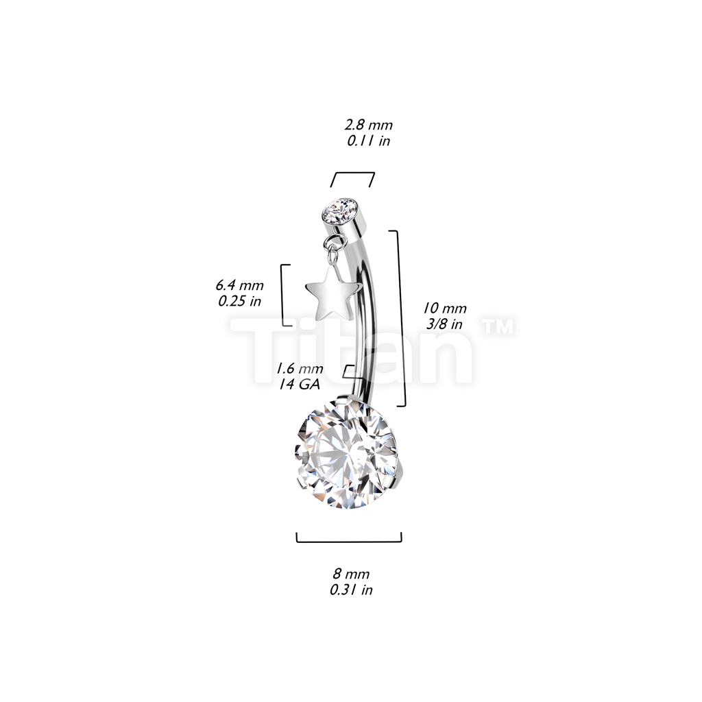 Implant Grade Titanium Threadless Push In Prong Set Bottom With Round Bezel Set CZ and Star Dangle Top Belly Button Ring