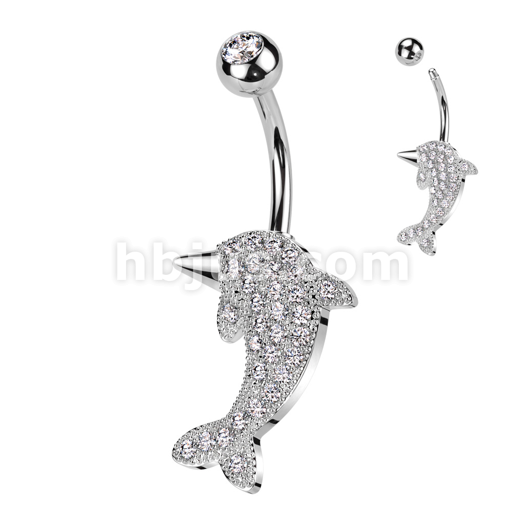 316L Surgical Steel Belly Ring With Pave CZ Dolphin