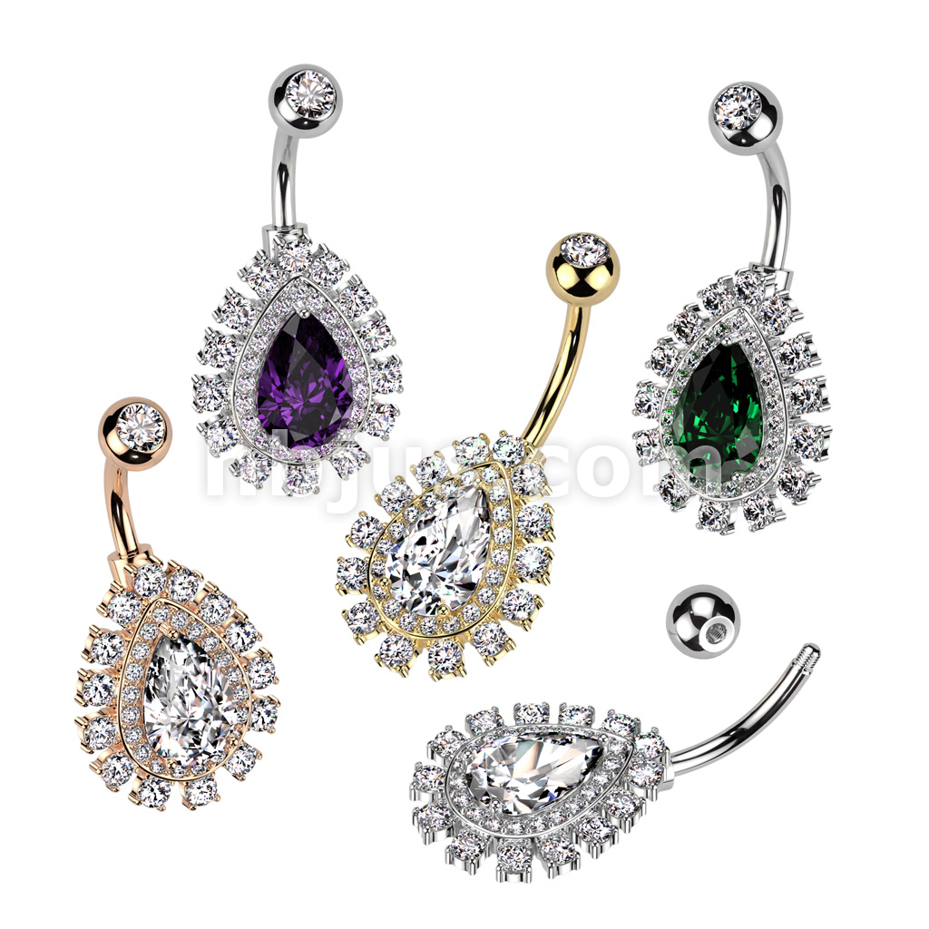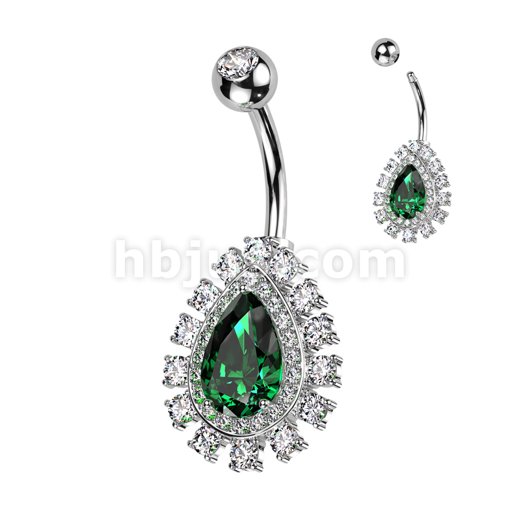 316L Surgical Steel Belly Ring With Large Teardrop CZ Center and Pave CZ Edge