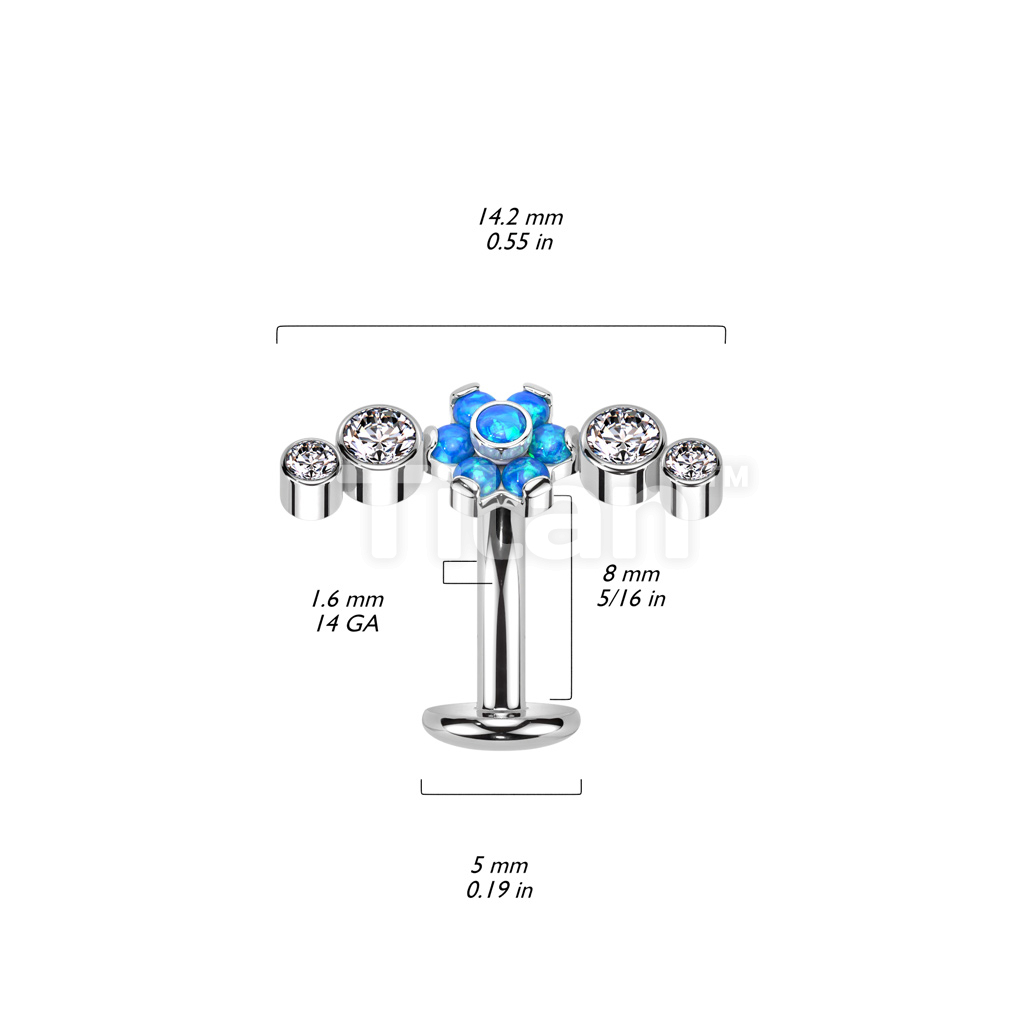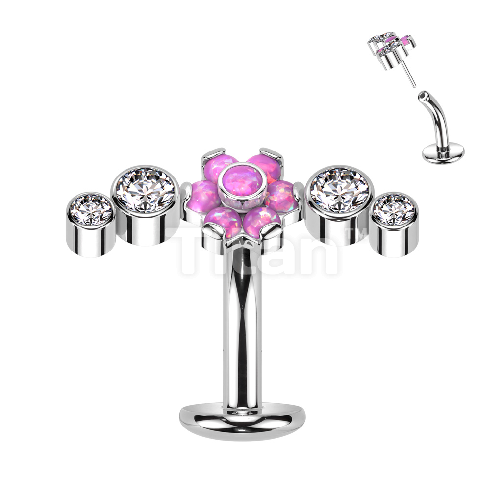 Implant Grade Titanium Threadless Floating Convex Base Belly Button Ring With Opal Flower Center and Double Bezel Set CZs