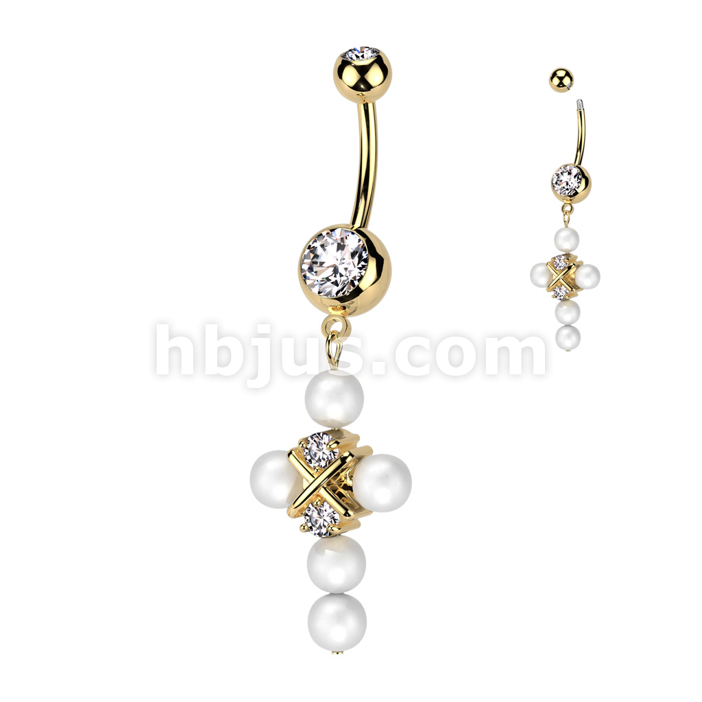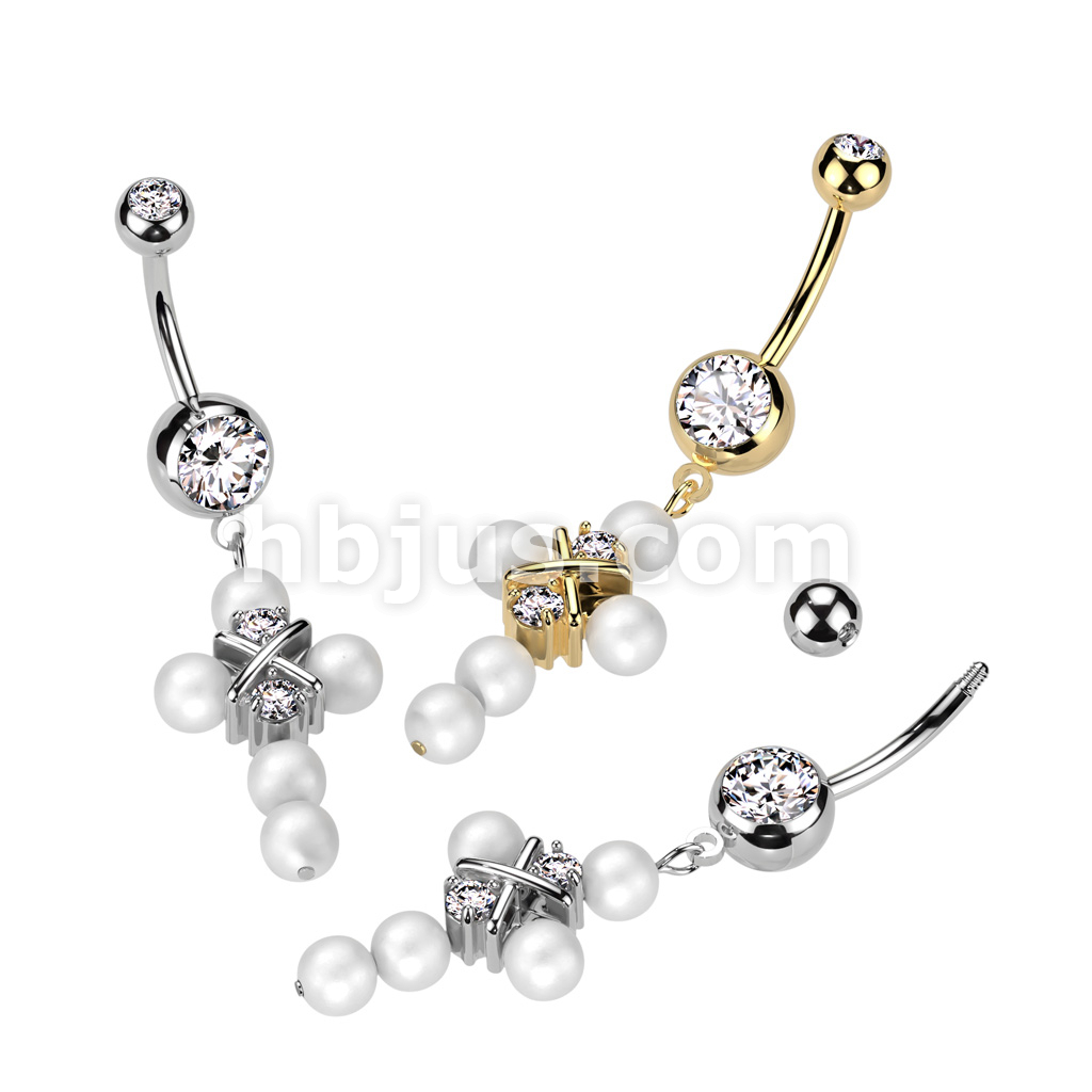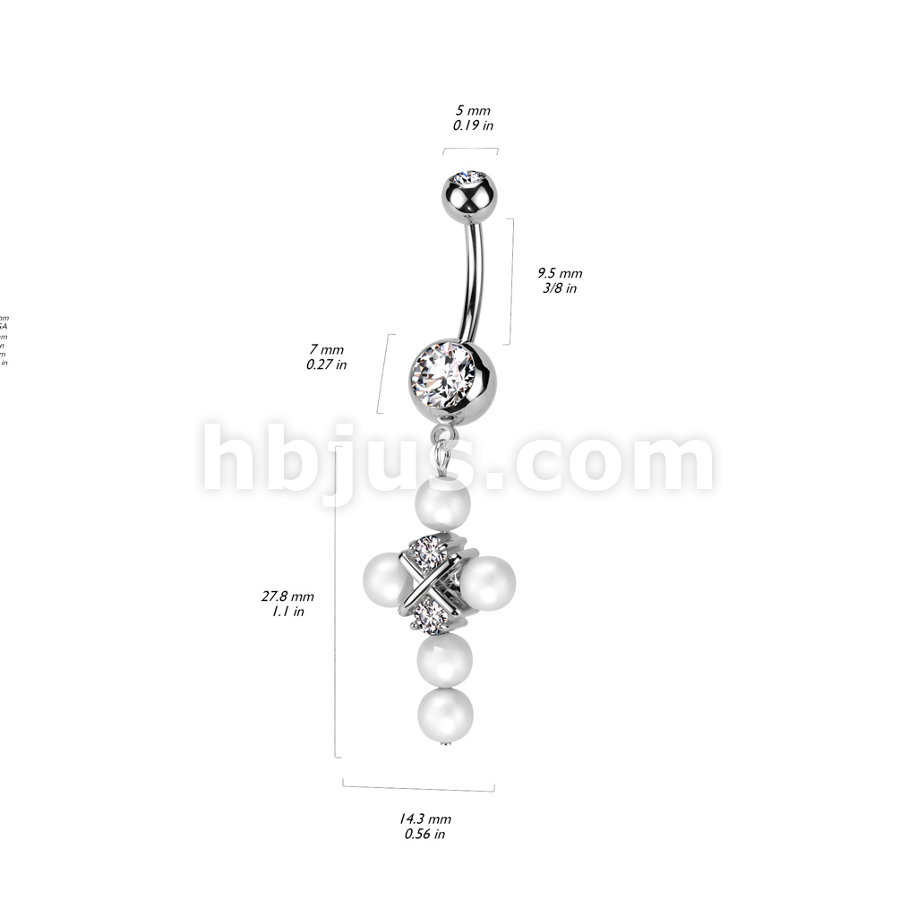 316L Surgical Steel Double Jeweled Belly Button Ring Dangle Pearl Cross With 2 Gem Center