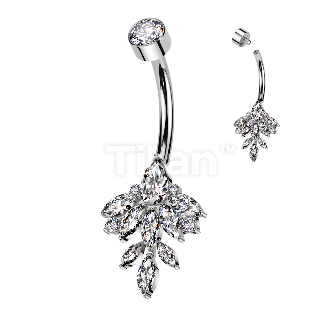 Implant Grade Titanium Internally Threaded Bezel Set CZ Top With Marquise Leaf CZ Vine Belly Button Ring