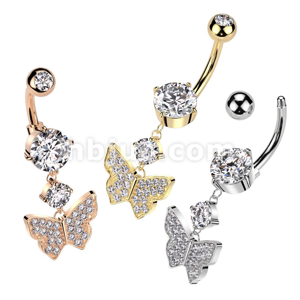 316L Surgical Steel Pressed Fit CZ Top and Round Prong Set CZ Bottom With Pave CZ Butterfly and Prong Set CZ Dangle Belly Button Ring