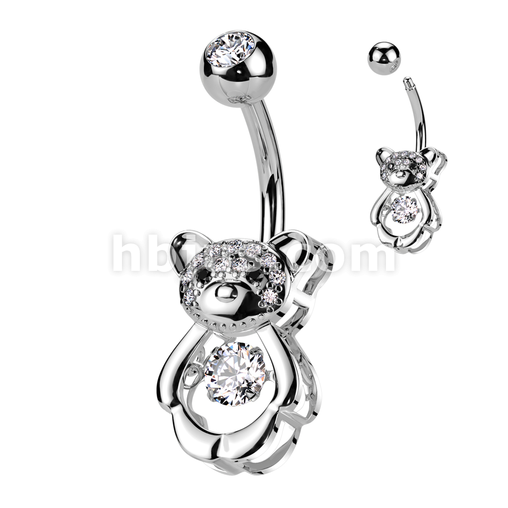316L Surgical Steel Pave CZ Hollow Bear With Round Prong Set CZ Dangle Center Belly Button Ring