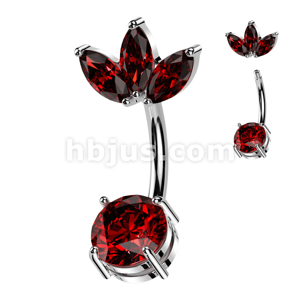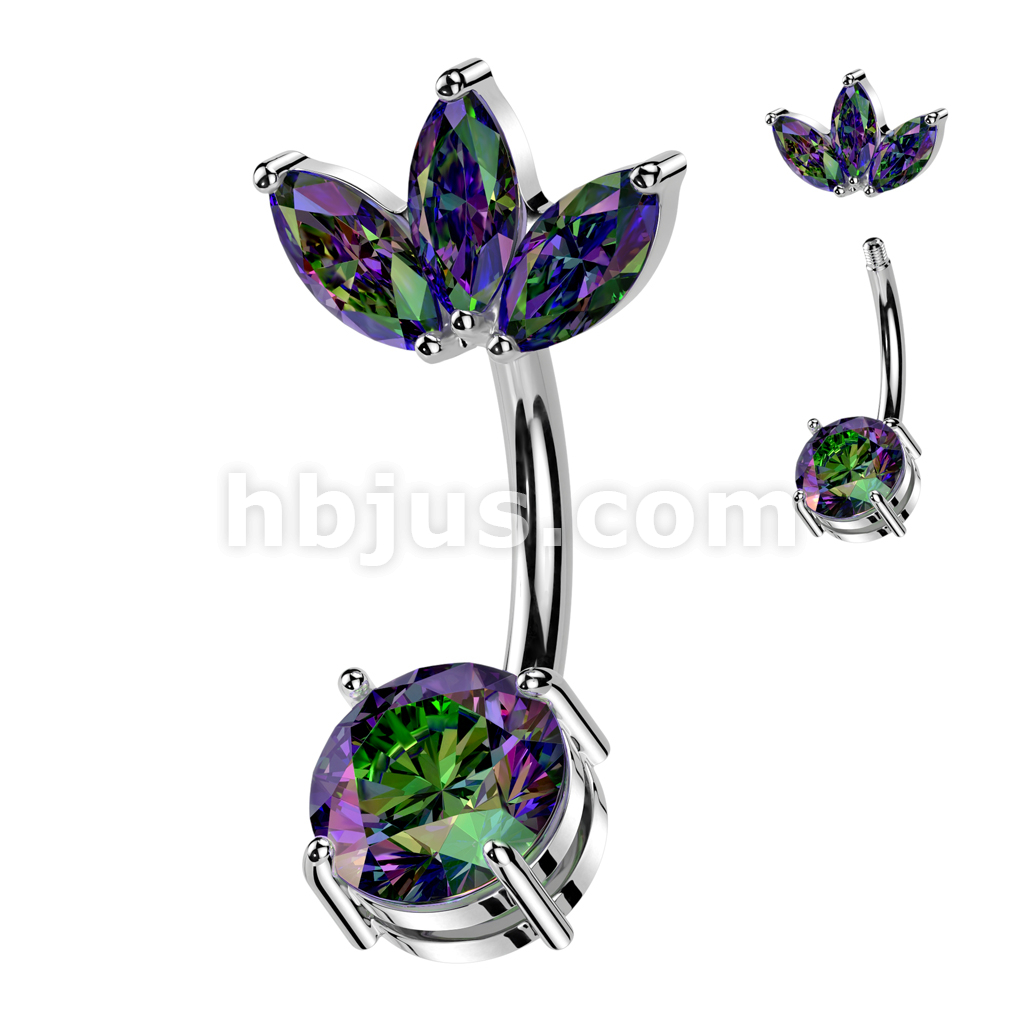 316L Surgical Steel Belly Ring With Prong Set CZ Bottom and 3 Marquise CZ Fan Top