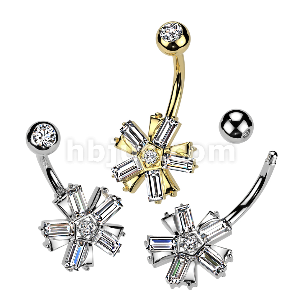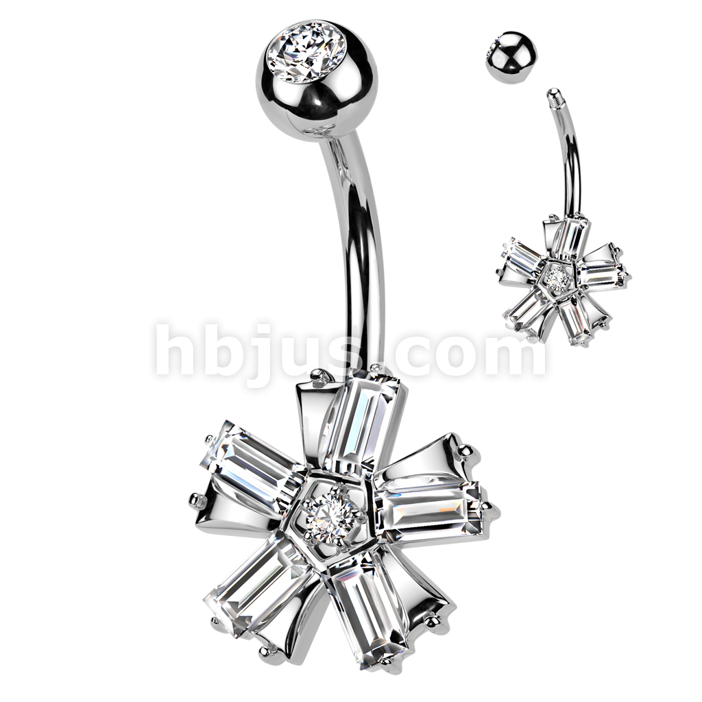 316L Surgical Steel Belly Button Ring With Baguette CZ Flower