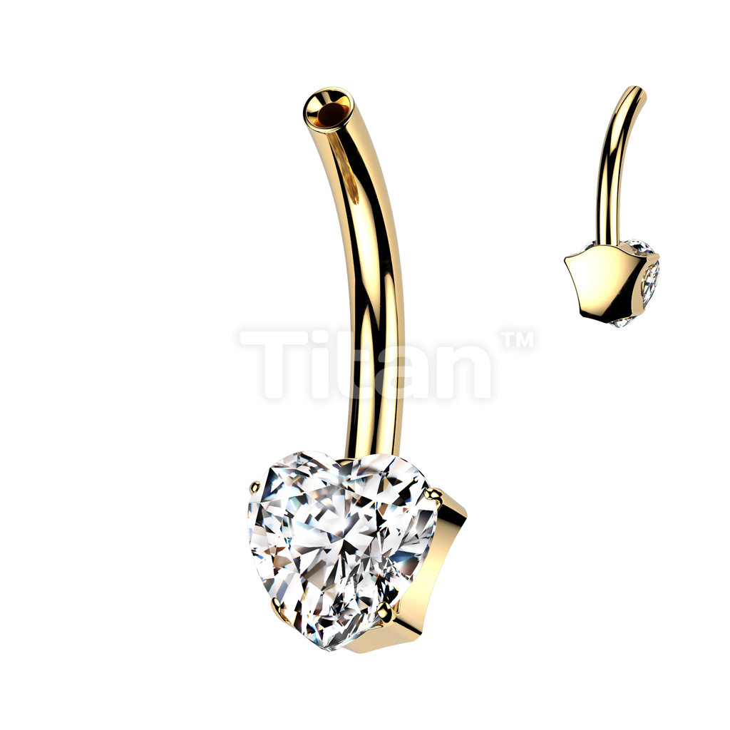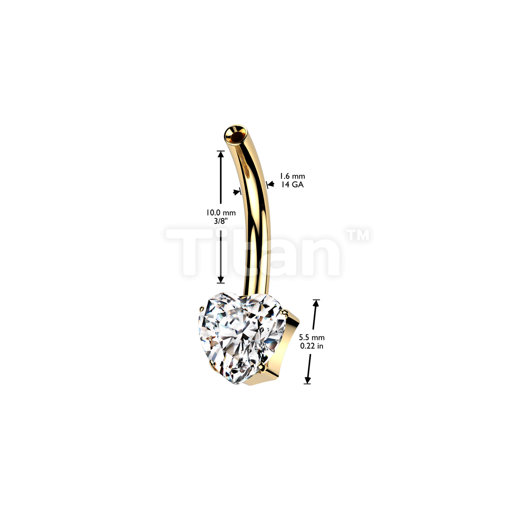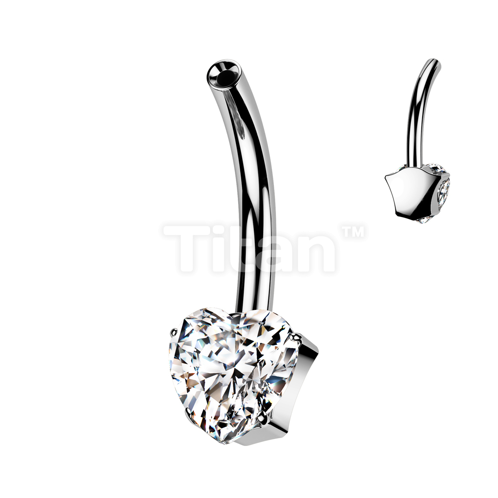 Implant Grade Titanium Threadless Push In Belly Button Pin With One Fixed Prong Set Heart CZ