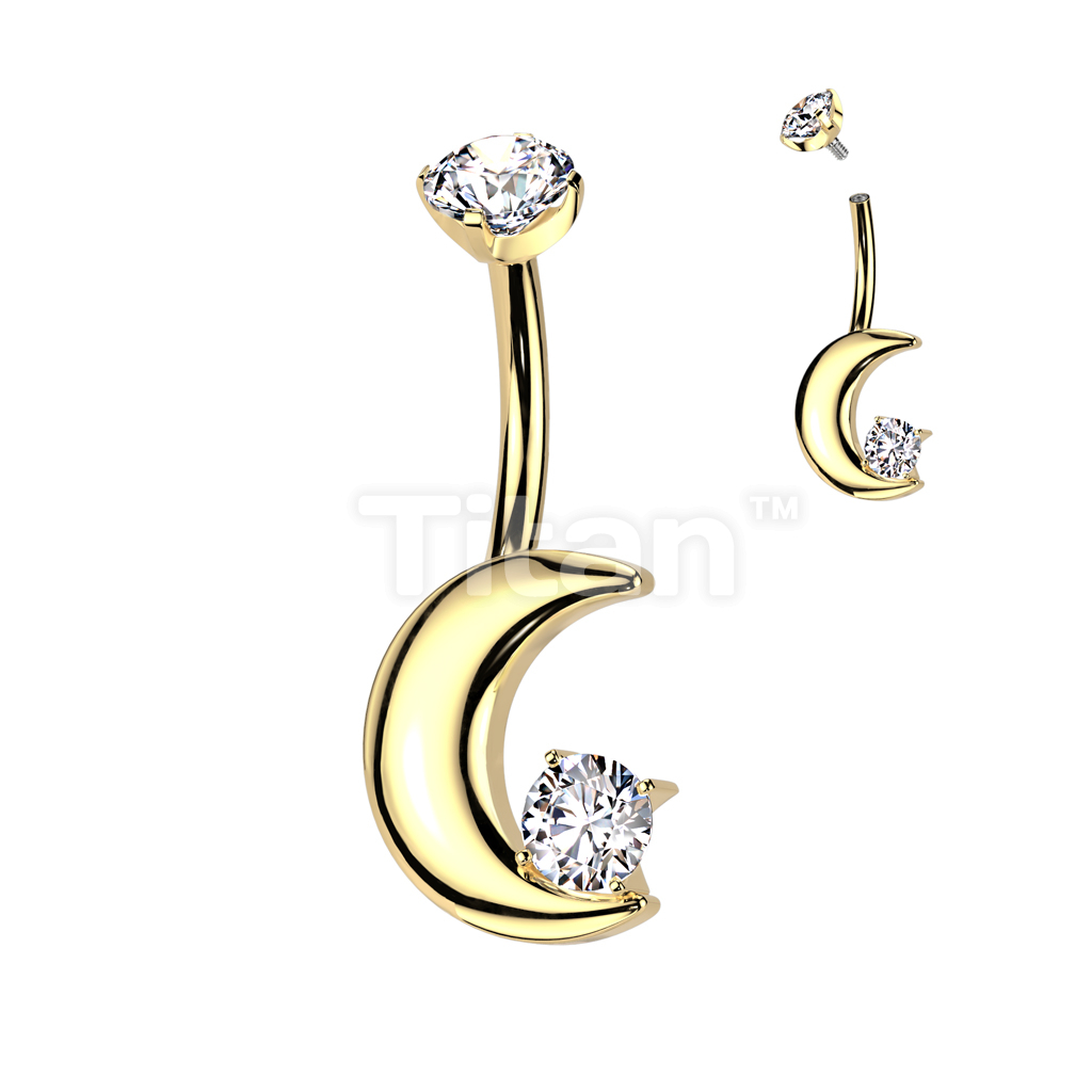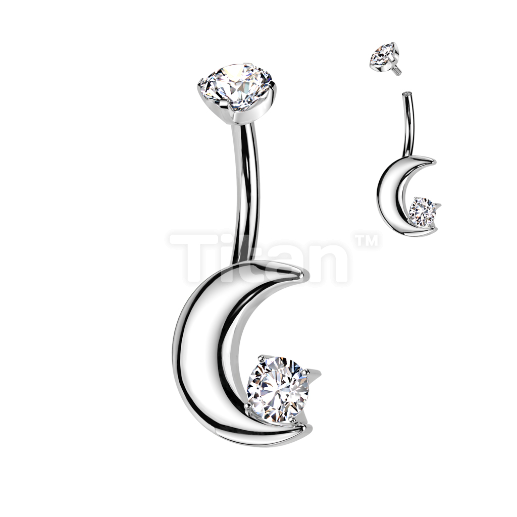 Implant Grade Titanium Internally Threaded Crescent Moon With CZ and Round CZ Prong Set Top Belly Button Ring