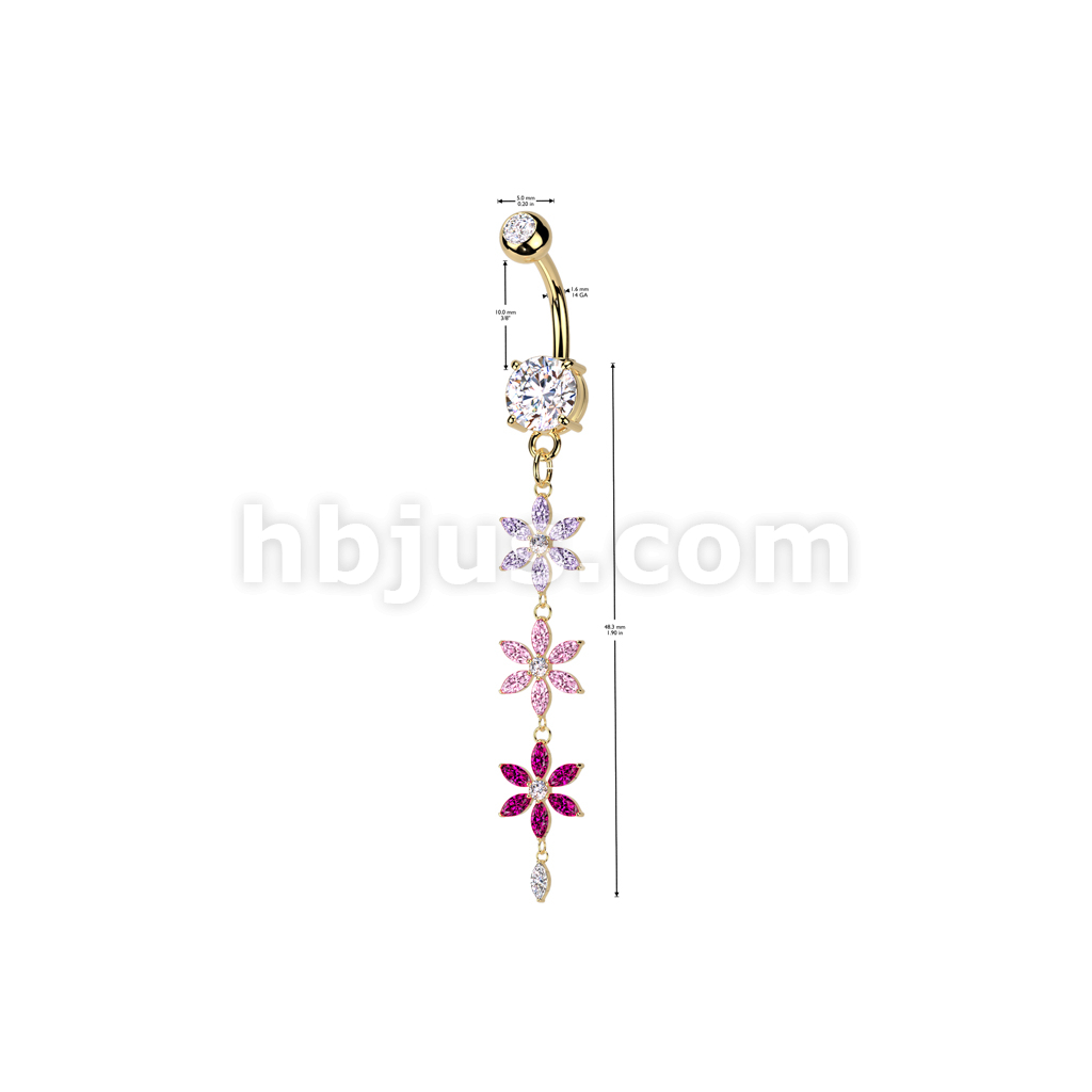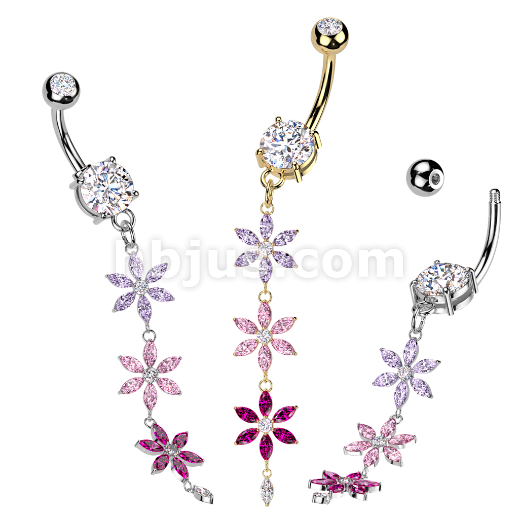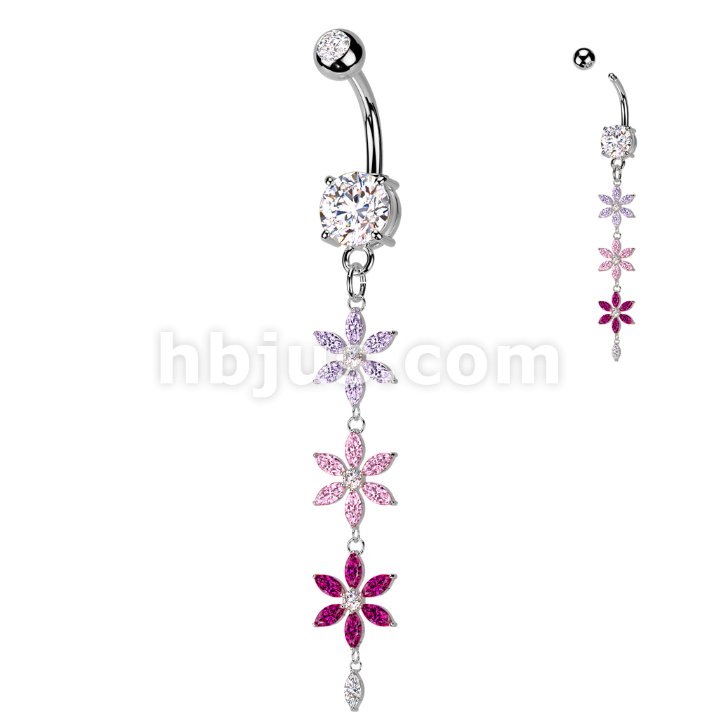 316L Surgical Steel Double Jeweled Belly Button Ring With Multicolored Triple CZ Flower Dangle