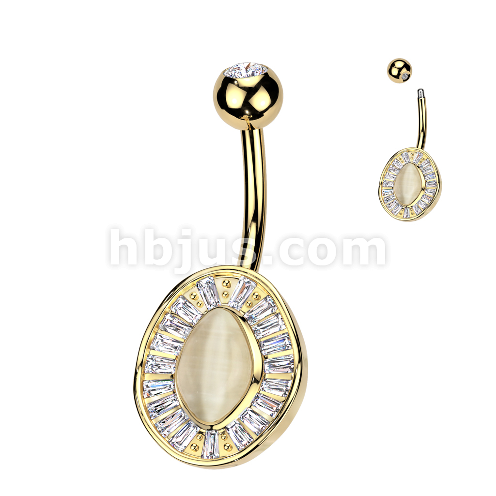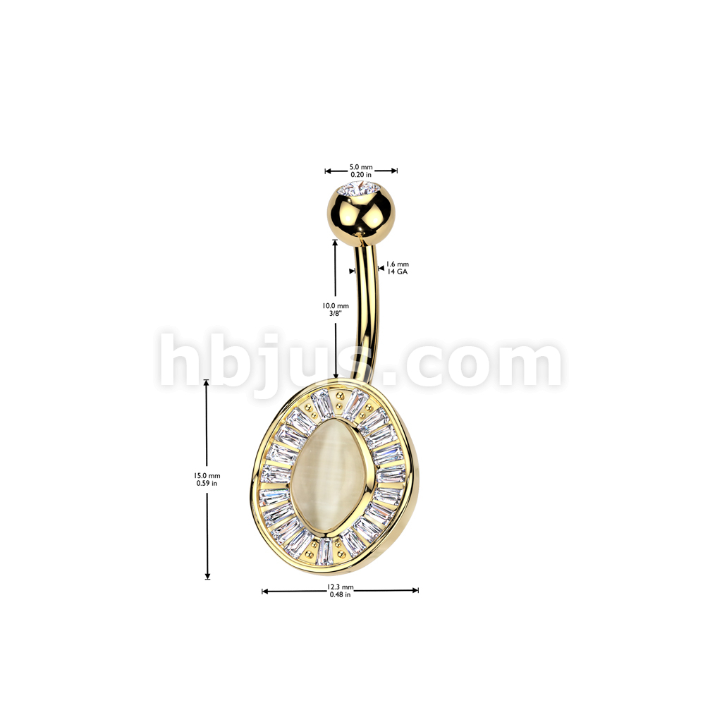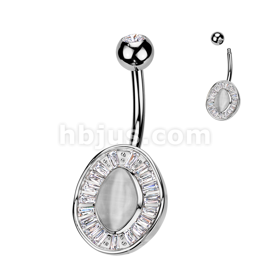 316L Surgical Steel Baguette CZ Edge With Cat's Eye Stone Center Belly Button Navel Ring