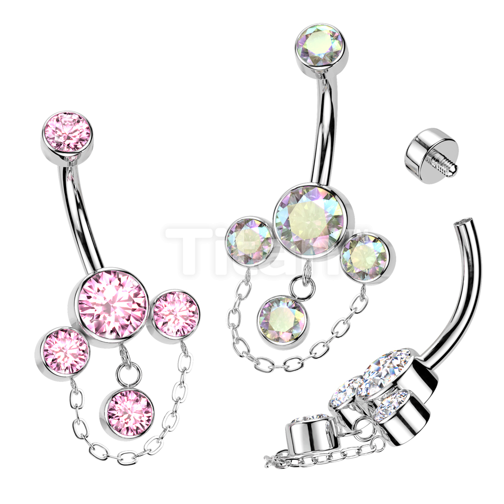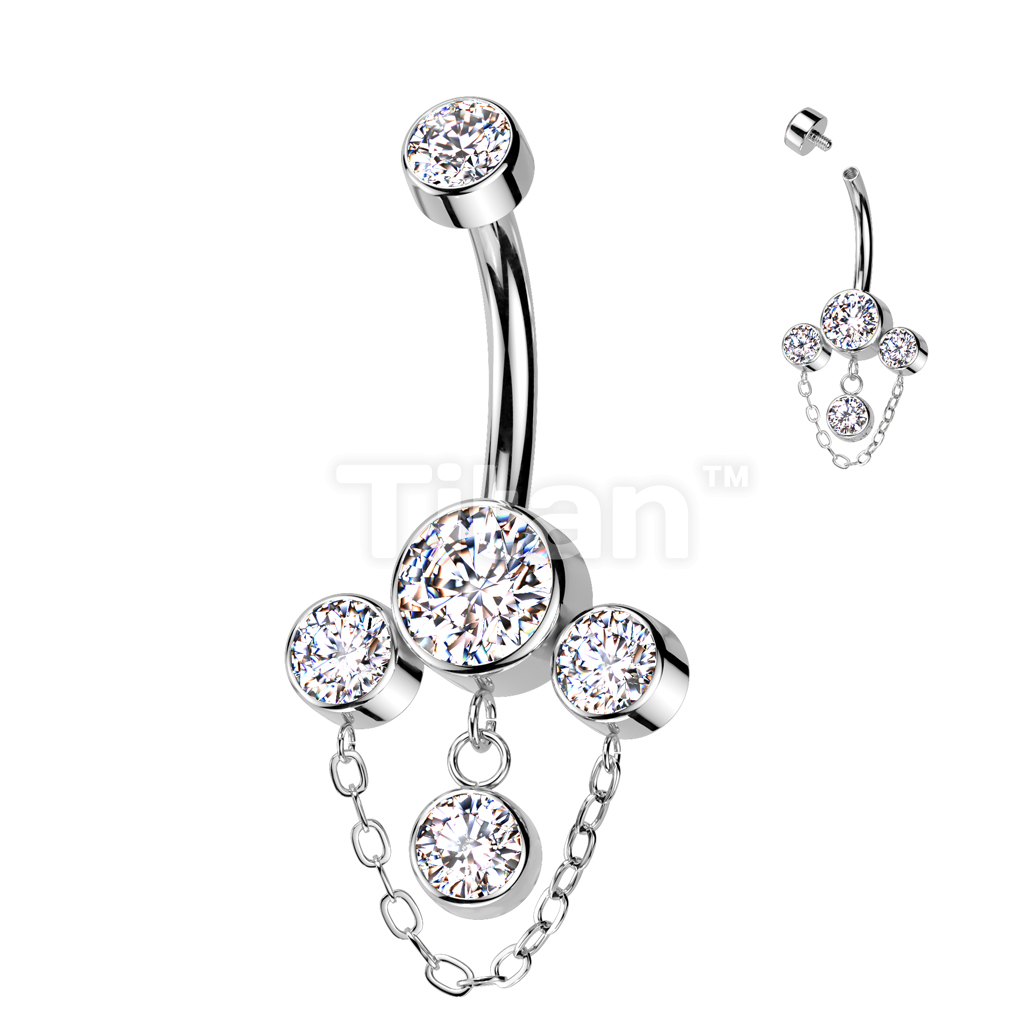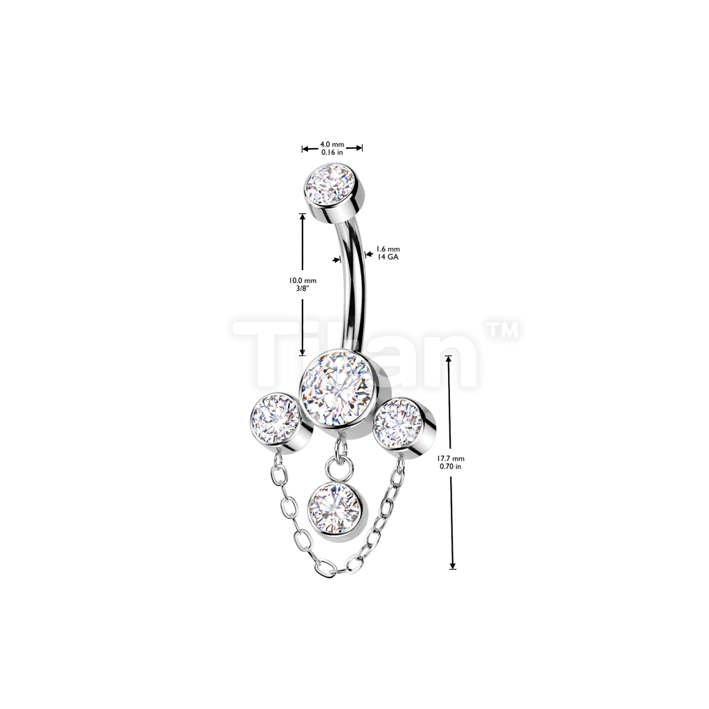 Implant Grade Titanium Internally Threaded Triple Bezel Set CZ Belly Button Ring With CZ and Chain Dangle