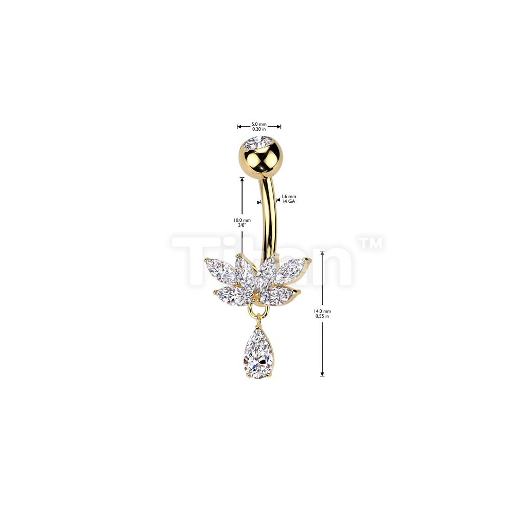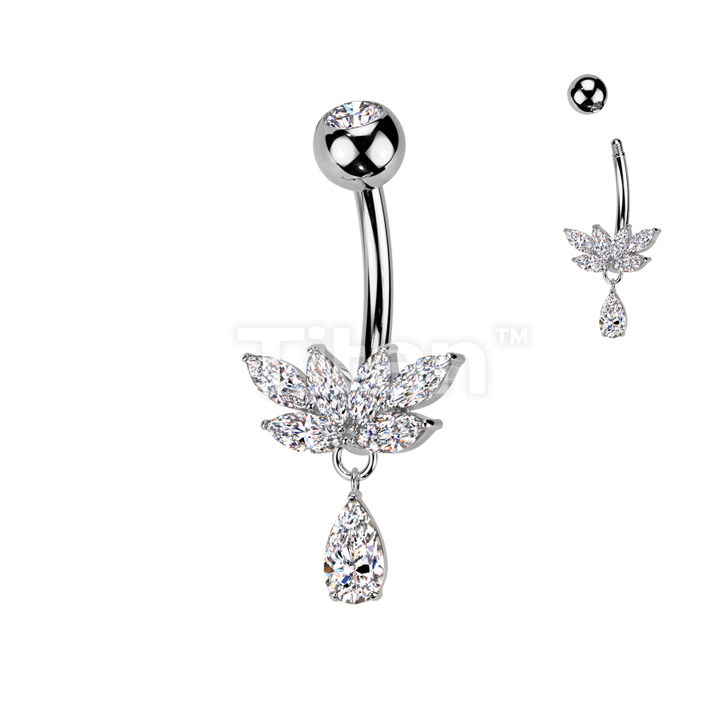 Implant Grade Titanium Bezel Set CZ Top With Brass Marquise CZ Fan And CZ Teardrop Dangle Belly Button Ring