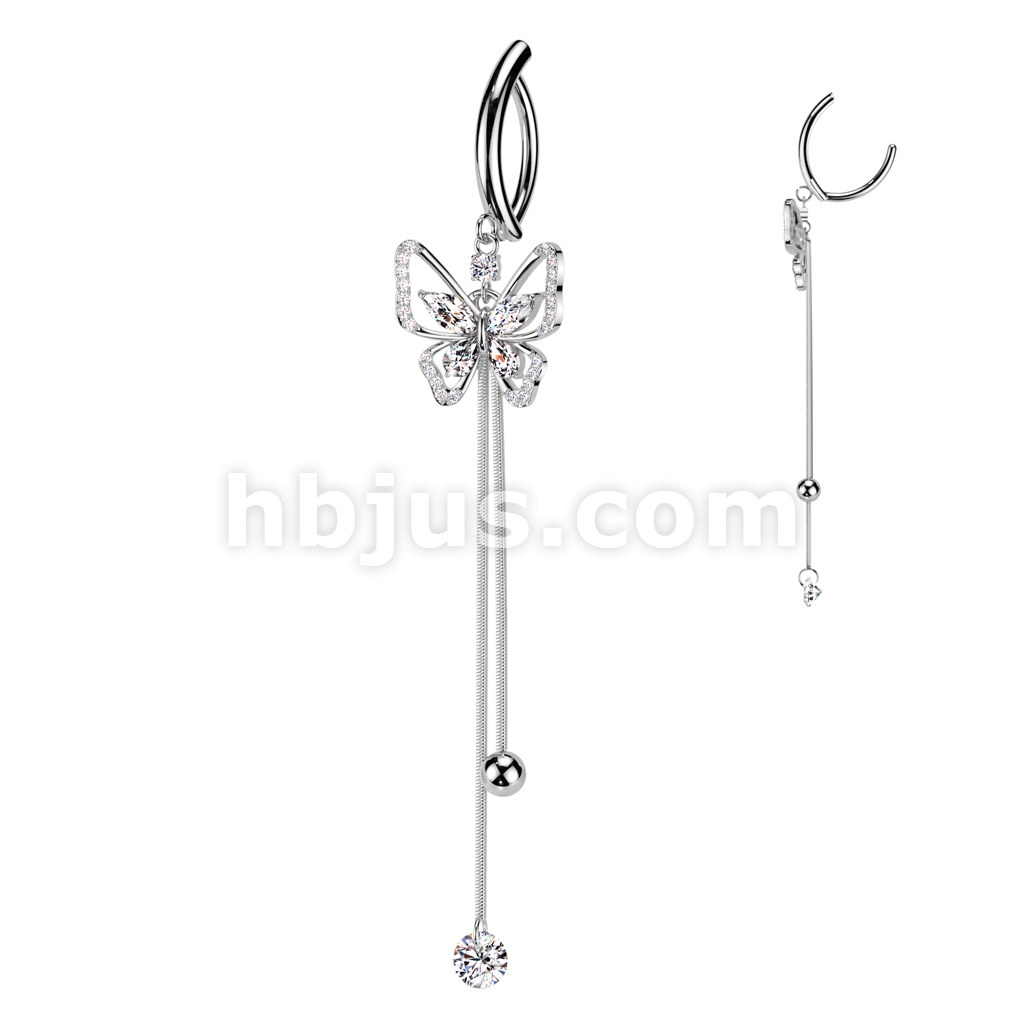 316L Surgical Steel Hinged CZ Butterfly Belly Button Ring With Ball And Gem Dangle
