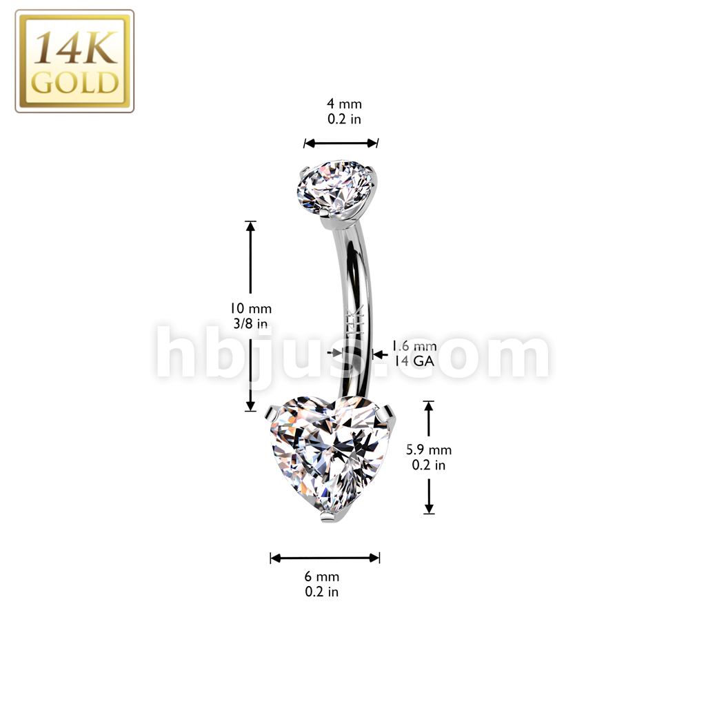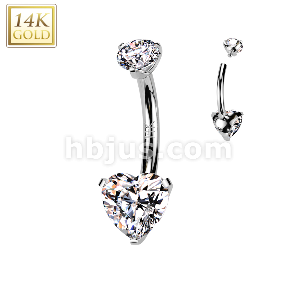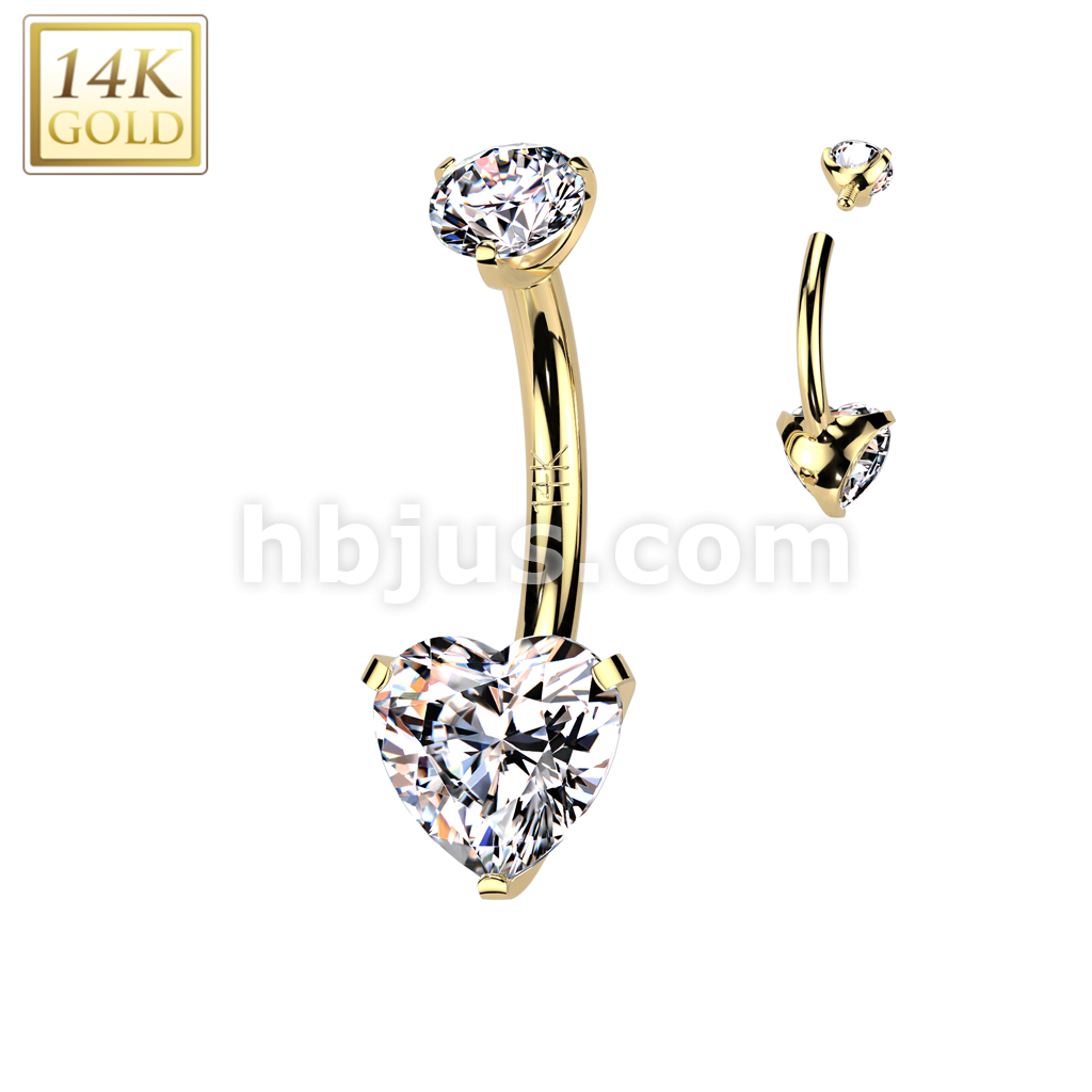14K Gold Internally Threaded Heart Prong Set CZ Bottom Belly Button Navel Ring With Prong Set CZ Top
