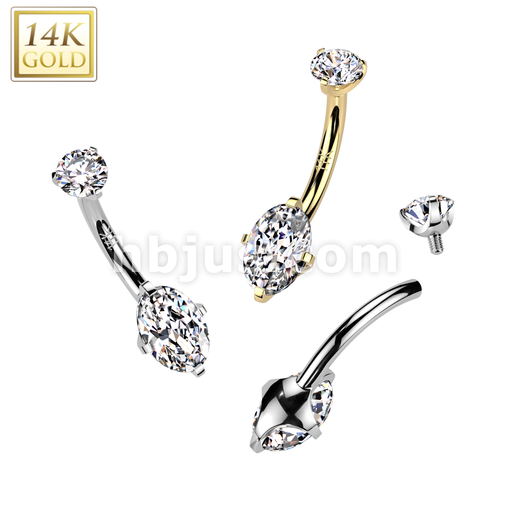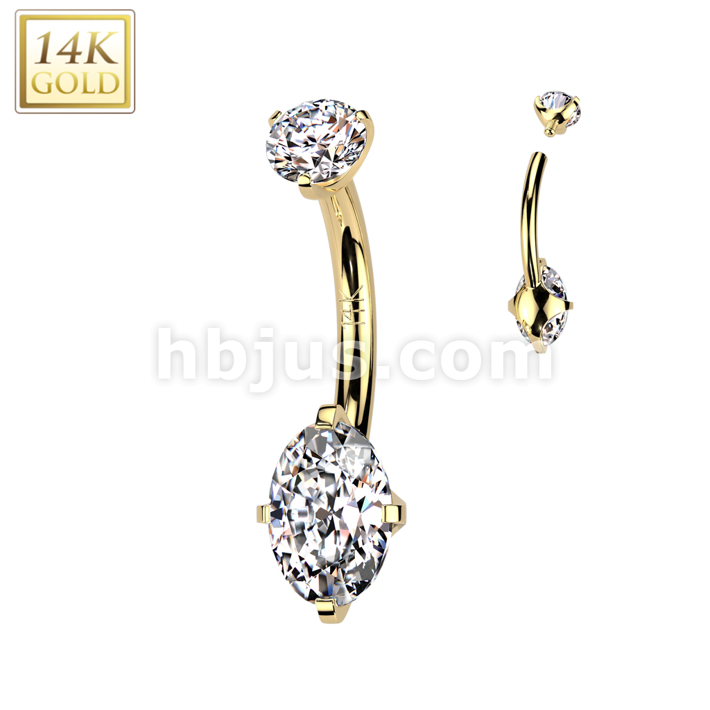 14K Gold Internally Threaded Oval Prong Set CZ Bottom Belly Button Navel Ring With Prong Set CZ Top