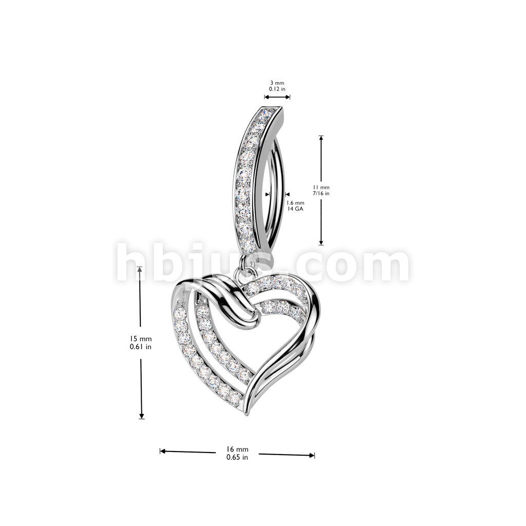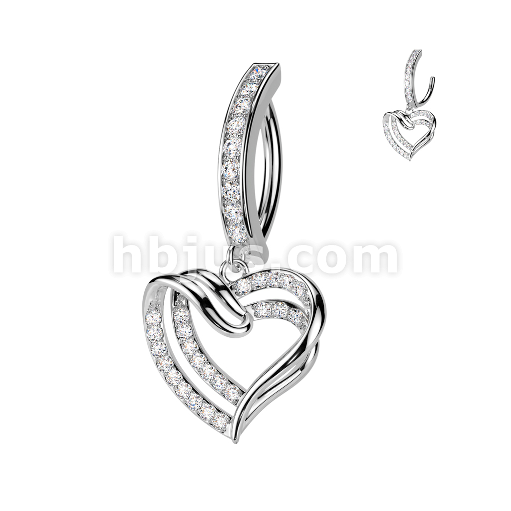 316L Surgical Steel Hinged CZ Pave Belly Button Ring With Double CZ Pave Heart Dangle