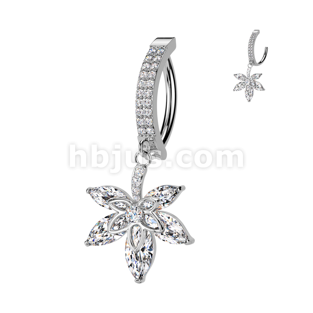 316L Surgical Steel Hinged Double CZ Pave Belly Button Ring With CZ Pot Leaf Dangle