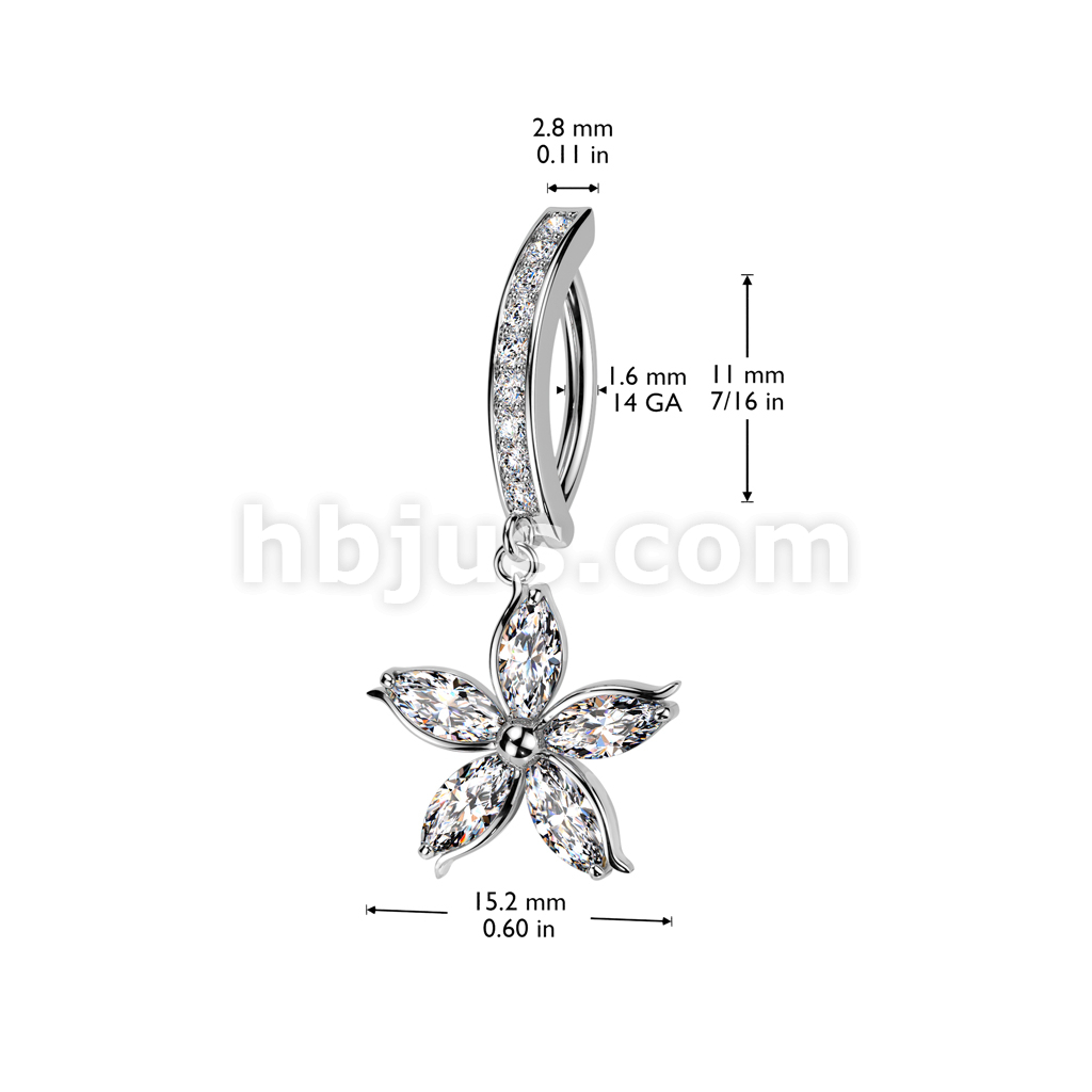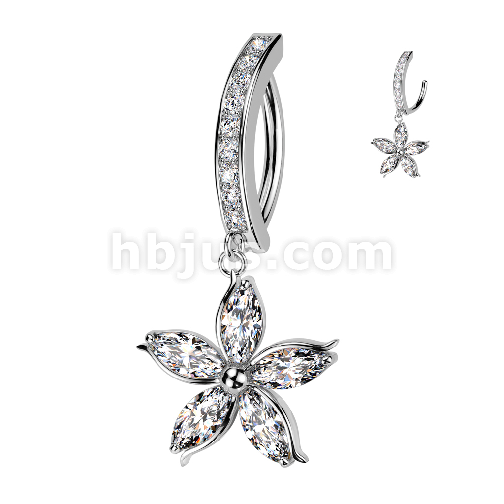316L Surgical Steel Hinged Pave CZ Belly Button Ring With Marquise CZ Flower Dangle