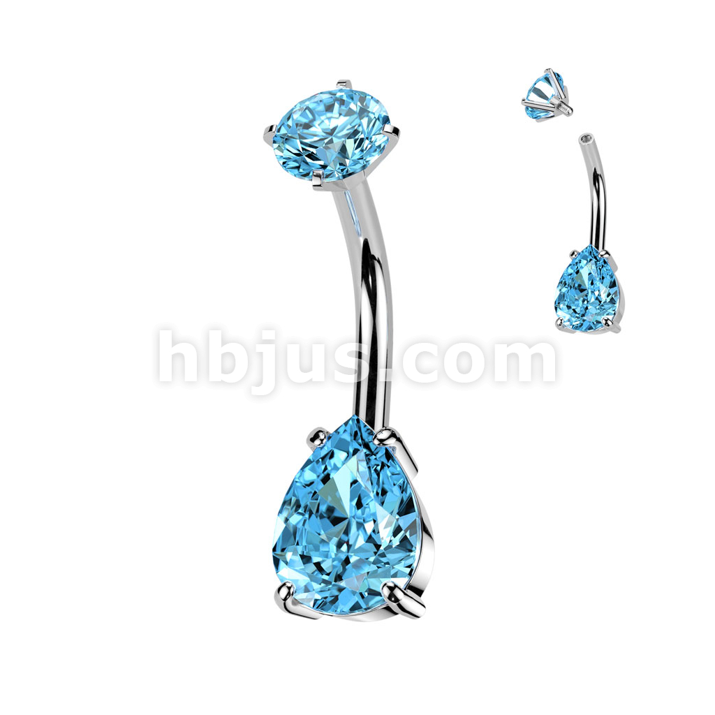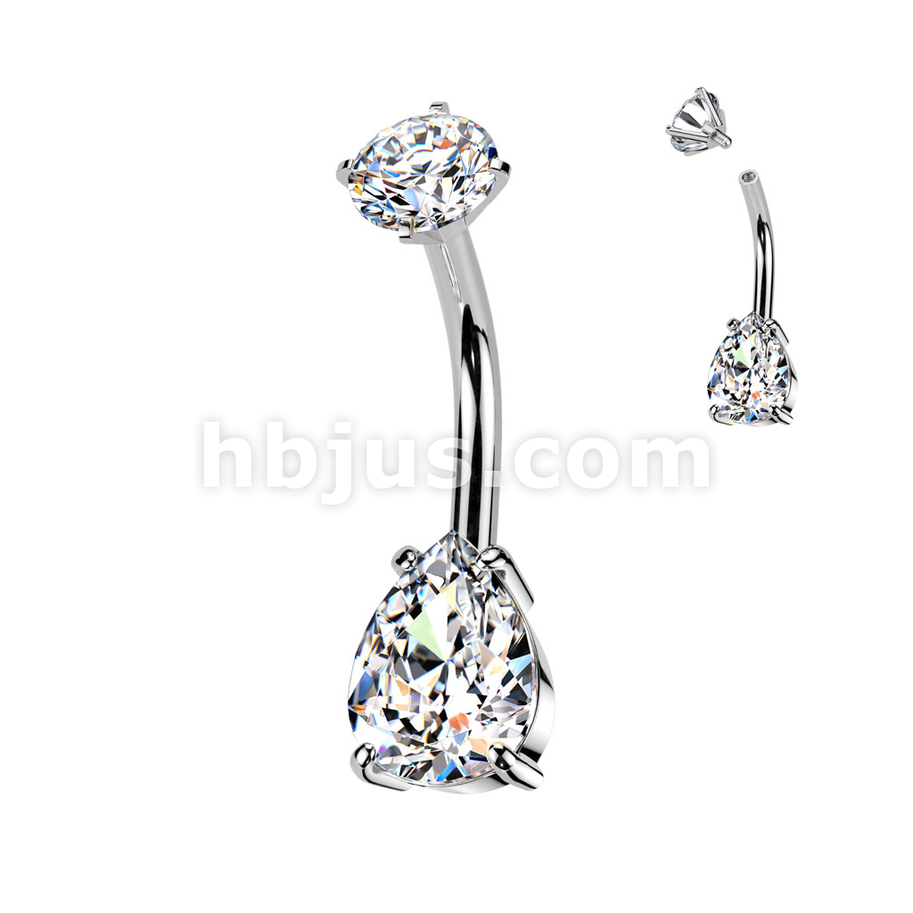 All 316L Surgical Steel Internally Threaded Prong Set Teardrop CZ Belly Button Ring With Round CZ Prong Set Top