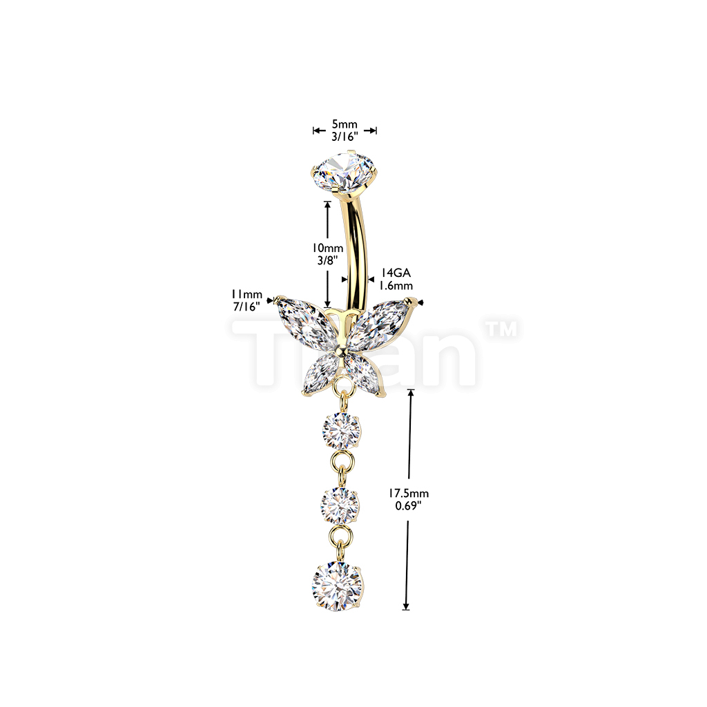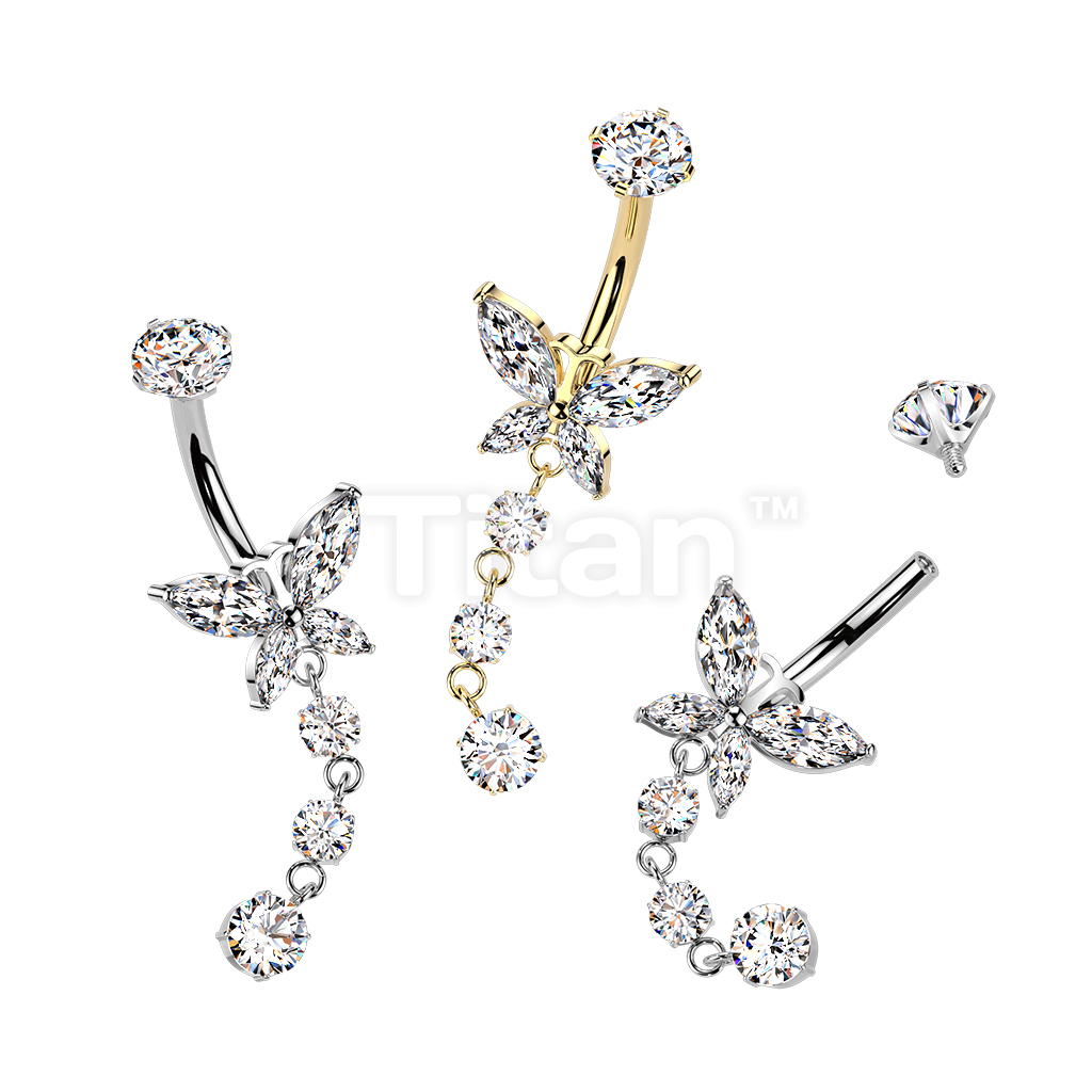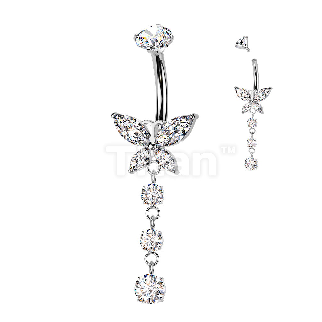 Titanium Internally Threaded Marquise CZ Butterfly With CZ Dangle Belly Button Ring
